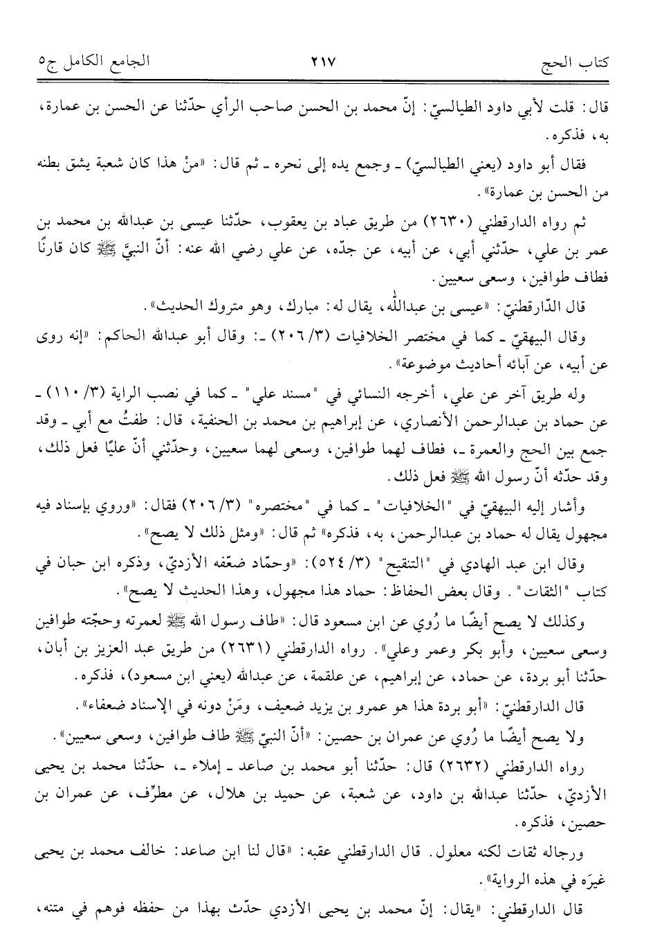 ثم رواه الدارقطني (٢٦٣٠) من طريق عباد بن يعقوب، حدّثنا عيسى بن عبد الله بن محمد بن عمر بن علي، حدّثني أبي، عن أبيه، عن جدّه، عن علي رضي الله عنه: أنّ النبيَّ - صلى الله عليه وسلم - كان قارنًا فطاف طوافين، وسعى سعيين.