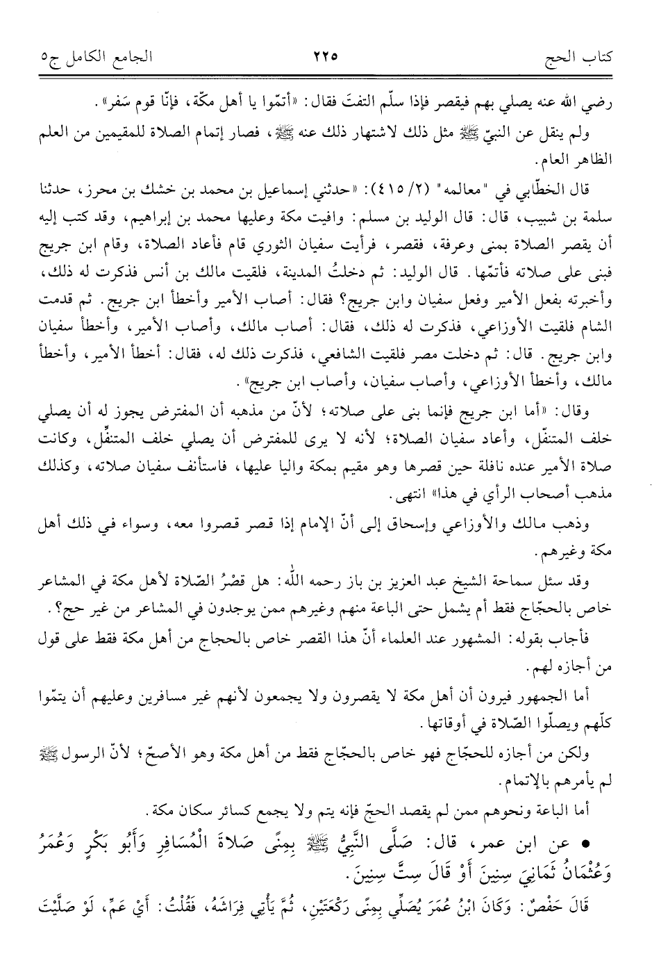 قال الخطّابي في "معالمه" (٢/ ٤١٥): "حدثني إسماعيل بن محمد بن خشك بن محرز، حدثنا سلمة بن شبيب، قال: قال الوليد بن مسلم: وافيت مكة وعليها محمد بن إبراهيم، وقد كتب إليه أن يقصر الصلاة بمنى وعرفة، فقصر، فرأيت سفيان الثوري قام فأعاد الصلاة، وقام ابن جريج فبني على صلاته فأتمّها. قال الوليد: ثم دخلتُ المدينة، فلقيت مالك بن أنس فذكرت له ذلك، وأخبرته بفعل الأمير وفعل سفيان وابن جريج؟ فقال: أصاب الأمير وأخطأ ابن جريج. ثم قدمت الشام فلقيت الأوزاعي، فذكرت له ذلك، فقال: أصاب مالك، وأصاب الأمير، وأخطأ سفيان وابن جريج. قال: ثم دخلت مصر فلقيت الشافعي، فذكرت ذلك له، فقال: أخطأ الأمير، وأخطأ مالك، وأخطأ الأوزاعي، وأصاب سفيان، وأصاب ابن جريج".