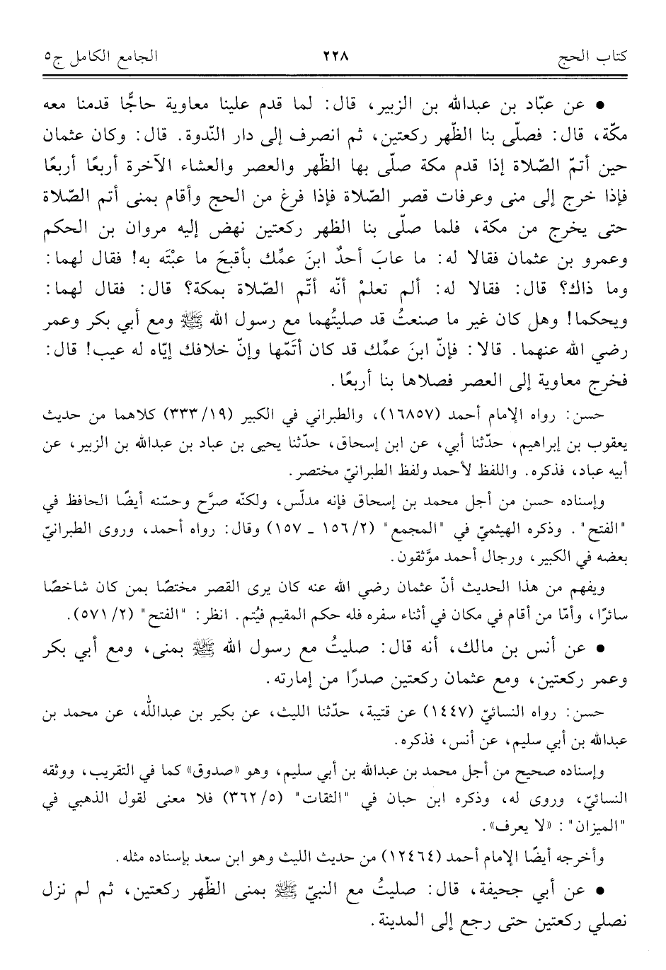 • عن عبّاد بن عبد الله بن الزبير، قال: لما قدم علينا معاوية حاجًّا قدمنا معه مكّة، قال: فصلّي بنا الظّهر ركعتين، ثم انصرف إلى دار النّدوة، قال: وكان عثمان حين أتمّ الصّلاة إذا قدم مكة صلّى بها الظّهر والعصر والعشاء الآخرة أربعًا أربعًا فإذا خرج إلى منى وعرفات قصر الصّلاة فإذا فرغ من الحج وأقام بمنى أتم الصّلاة حتى يخرج من مكة، فلما صلّى بنا الظهر ركعتين نهض إليه مروان بن الحكم وعمرو بن عثمان فقالا له: ما عابَ أحدٌ ابنَ عمِّك بأقبحَ ما عبْتَه به! فقال لهما: وما ذاك؟ قال: فقالا له: ألم تعلمْ أنّه أتّم الصّلاة بمكة؟ قال: فقال لهما: ويحكما! وهل كان غير ما صنعتُ قد صليتُهما مع رسول الله - صلى الله عليه وسلم - ومع أبي بكر وعمر رضي الله عنهما. قالا: فإنّ ابنَ عمِّك قد كان أتَمّها وإنّ خلافك إيّاه له عيب! قال: فخرج معاوية إلى العصر فصلاها بنا أربعًا.