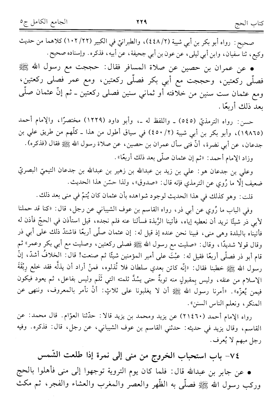• عن عمران بن حصين عن صلاة المسافر فقال: حججت مع رسول الله - صلى الله عليه وسلم - فصلّى ركعتين، وحججت مع أبي بكر فصلّى ركعتين، ومع عمر فصلى ركعتين، ومع عثمان ست سنين من خلافته أو ثماني سنين فصلى ركعتين - ثم إنّ عثمان صلّى بعد ذلك أربعًا.