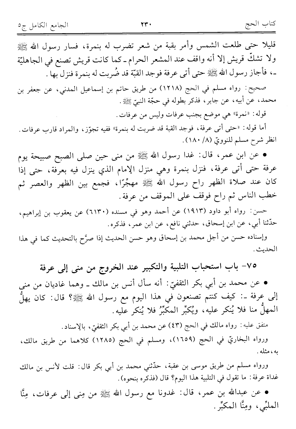• عن ابن عمر، قال: غدا رسول الله - صلى الله عليه وسلم - من مني حين صلي الصبح صبيحة يوم عرفة حتى أتي عرفة، فنزل بنمرة وهي منزل الإمام الذي ينزل فيه بعرفة، حتى إذا كان عند صلاة الظهر راح رسول الله - صلى الله عليه وسلم - مهجِّرًا، فجمع بين الظهر والعصر ثم خطب الناس ثم راح فوقف على الموقف من عرفة.