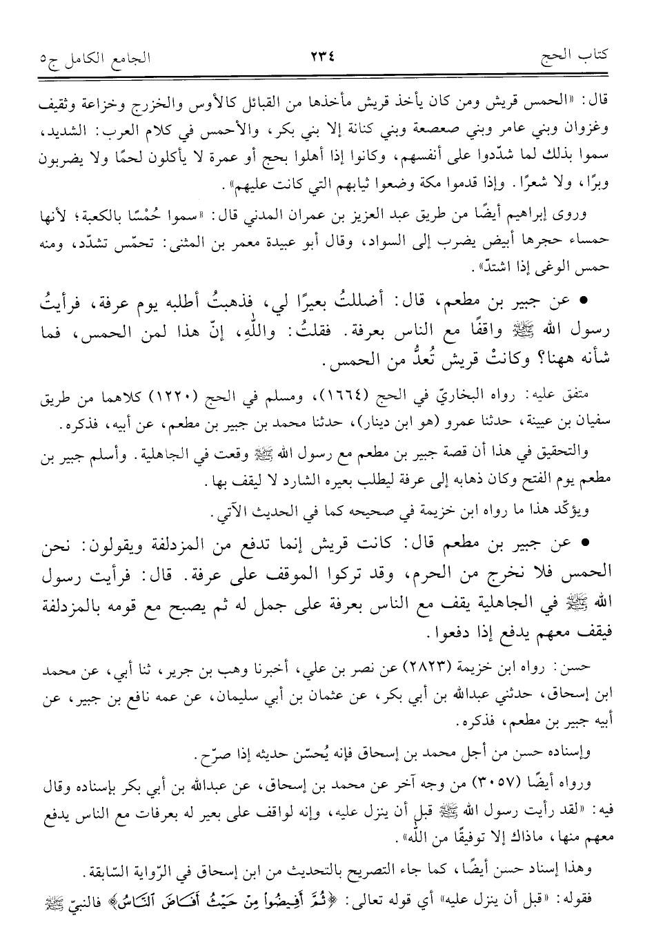 • عن جبير بن مطعم، قال: أضللتُ بعيرًا لي، فذهبتُ أطلبه يوم عرفة، فرأيتُ رسول الله - صلى الله عليه وسلم - واقفًا مع الناس بعرفة. فقلتُ: واللهِ، إنّ هذا لمن الحمس، فما شأنه ههنا؟ وكانتْ قريش تُعدُّ من الحمس.