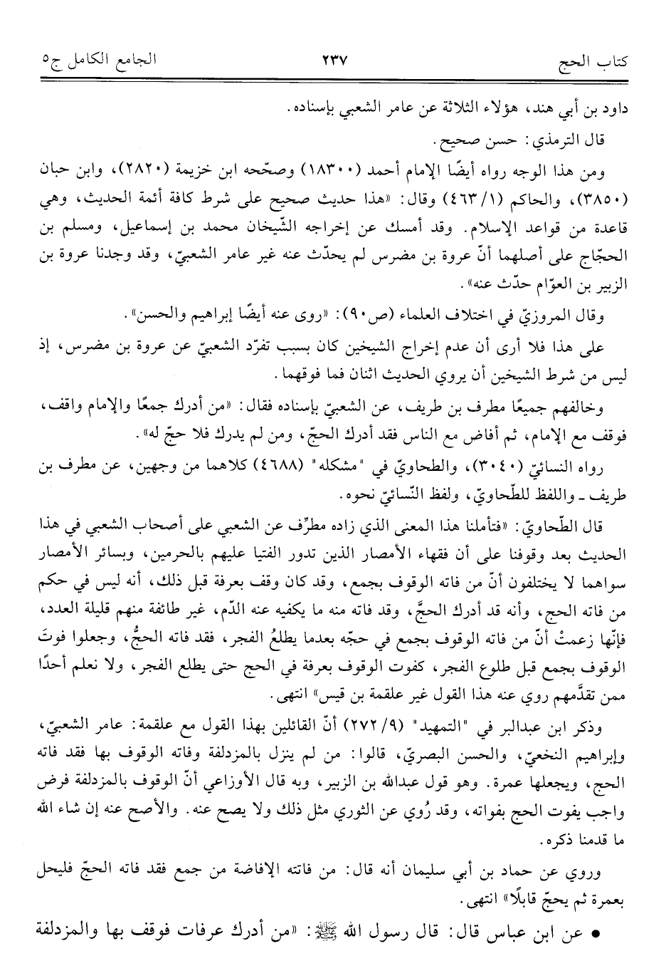 ومن هذا الوجه رواه أيضًا الإمام أحمد (١٨٣٠٠) وصحّحه ابن خزيمة (٢٨٢٠)، وابن حبان (٣٨٥٠)، والحاكم (١/ ٤٦٣) وقال: "هذا حديث صحيح على شرط كافة أئمة الحديث، وهي قاعدة من قواعد الإسلام. وقد أمسك عن إخراجه الشّيخان محمد بن إسماعيل، ومسلم بن الحجّاج على أصلهما أنّ عروة بن مضرس لم يحدّث عنه غير عامر الشعبيّ، وقد وجدنا عروة بن الزبير بن العوّام حدّث عنه".