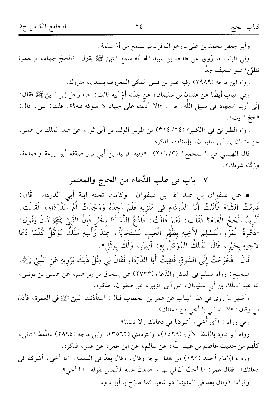 وفي الباب ما رُوي عن طلحة بن عبيد الله أنه سمع النبيّ - صلى الله عليه وسلم - يقول: "الحجّ جهاد، والعمرة تطوّع" فهو ضعيف جدًّا.