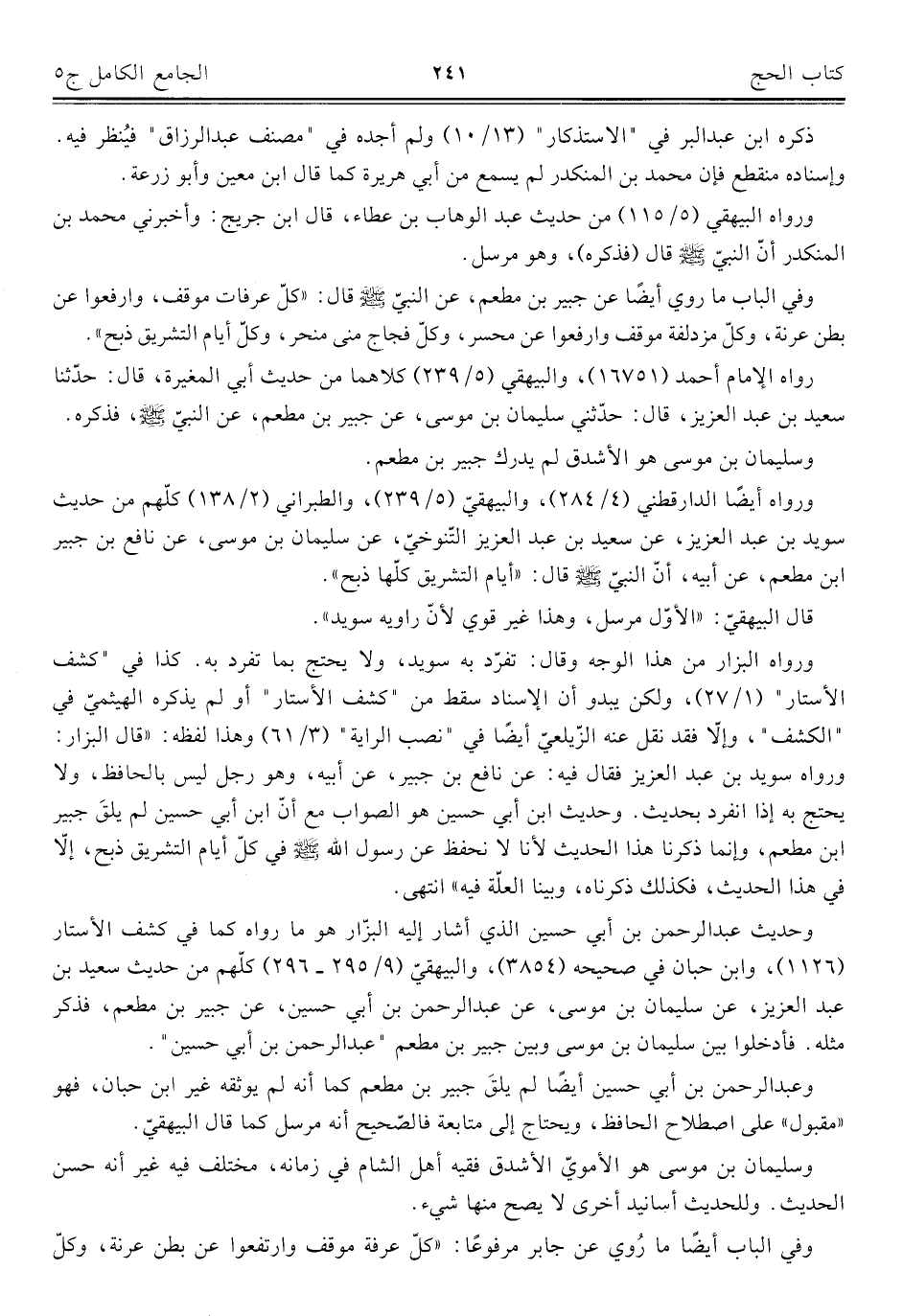 وفي الباب ما روي أيضًا عن جبير بن مطعم، عن النبيّ - صلى الله عليه وسلم - قال: "كلّ عرفات موقف، وارفعوا عن بطن عرنة، وكلّ مزدلفة موقف وارفعوا عن محسر، وكلّ فجاج مني منحر، وكلّ أيام التشريق ذبح".