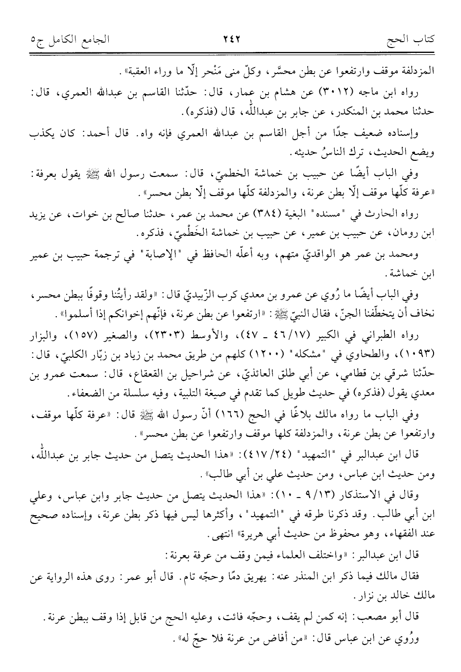 وقال في الاستذكار (١٣/ ٩ - ١٠): "هذا الحديث يتصل من حديث جابر وابن عباس، وعلي ابن أبي طالب، وقد ذكرنا طرقه في "التمهيد"، وأكثرها ليس فيها ذكر بطن عرنة، وإسناده صحيح عند الفقهاء، وهو محفوظ من حديث أبي هريرة" انتهى.