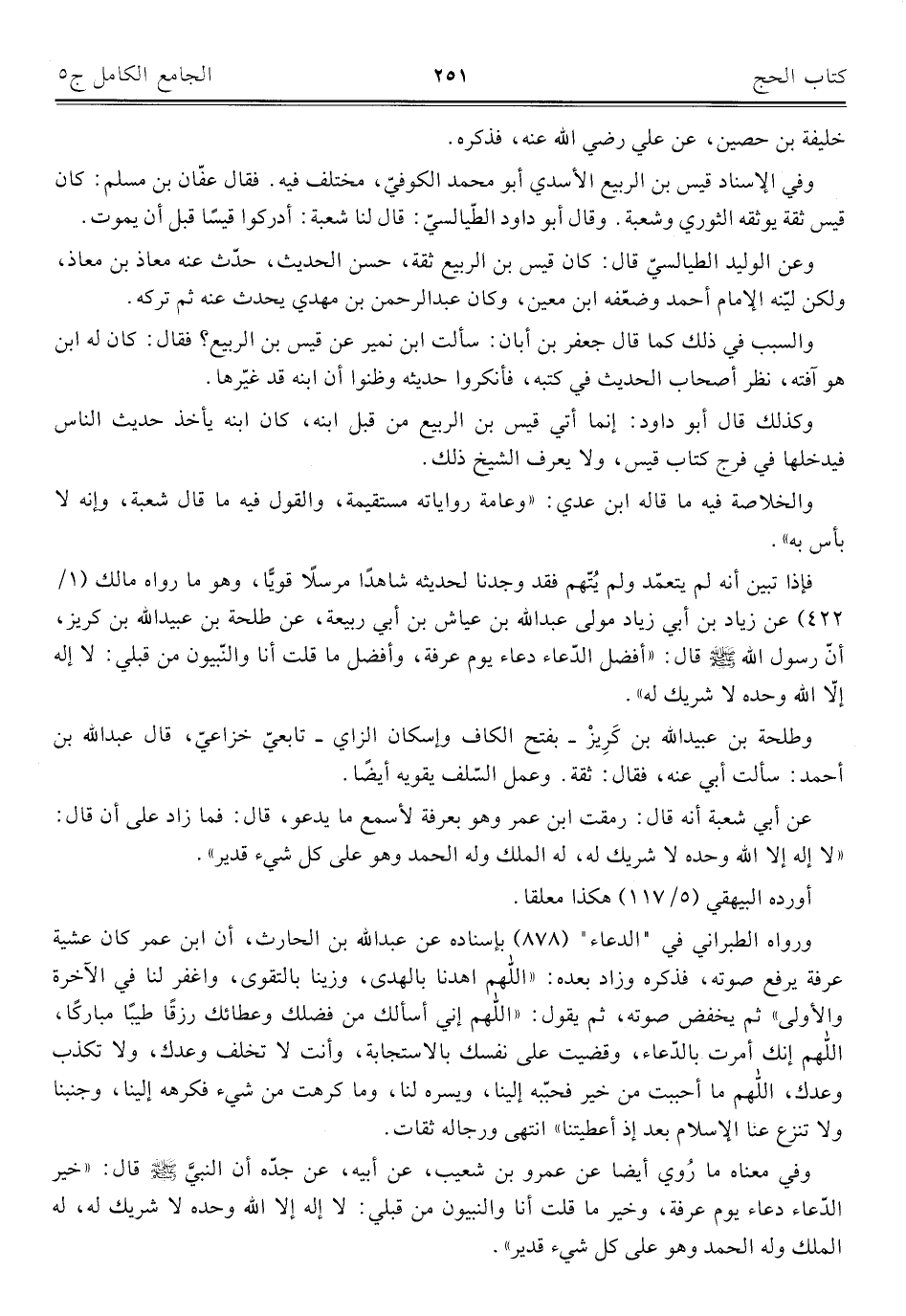 وفي معناه ما رُوي أيضا عن عمرو بن شعيب، عن أبيه، عن جدّه أن النبيَّ - صلى الله عليه وسلم - قال: "خير الدّعاء دعاء يوم عرفة، وخير ما قلت أنا والنبيون من قبلي: لا إله إلا الله وحده لا شريك له، له الملك وله الحمد وهو على كل شيء قدير".