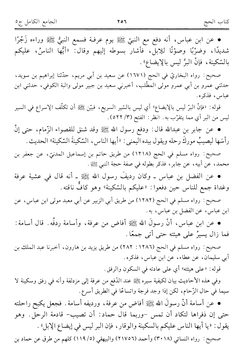 • عن أسامة أنّ رسولَ الله - صلى الله عليه وسلم - أفاض من عرفة، ورديفه أسامة. فجعل يكبح راحلته حتى إن ذفراها لتكاد أن تمس -وربما قال حماد: أن تصيب- قادمة الرحل. وهو يقول: "يا أيها الناس عليكم بالسكينة والوقار، فإن البر ليس في إيضاع الإبل".