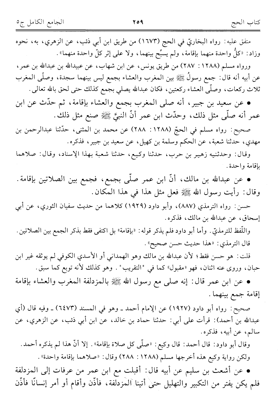 • عن عبد الله بن مالك، أنّ ابن عمر صلّى بجمع، فجمع بين الصلاتين بإقامة. وقال: رأيت رسول الله - صلى الله عليه وسلم - فعل مثل هذا في هذا المكان. حسن: رواه الترمذي (٨٨٧)، وأبو داود (١٩٢٩) كلاهما من حديث سفيان الثوري، عن أبي إسحاق، عن عبد الله بن مالك، فذكره.