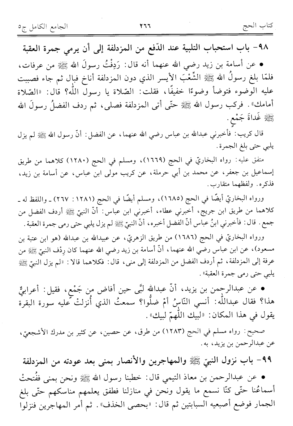 ٩٨ - باب استحباب التلبية عند الدّفع من المزدلفة إلى أن يرمي جمرة العقبة