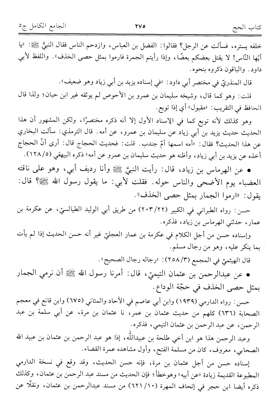 • عن الهرماس بن زياد، قال: رأيت النبيَّ - صلى الله عليه وسلم - وأنا رديف أبي، وهو على ناقته العضباء يوم الأضحى والناس حوله. فقلت لأبي: ما يقول رسول الله - صلى الله عليه وسلم -؟ قال: يقول: "ارموا الجمار بمثل حصى الخذف".