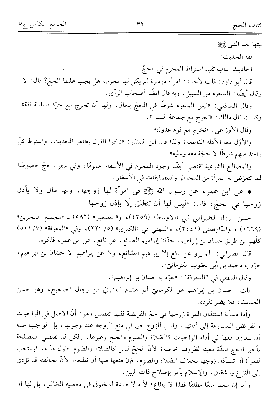 • عن ابن عمر، عن رسول الله - صلى الله عليه وسلم - في امرأة لها زوجها، ولها مال ولا يأذن زوجها في الحجّ، قال: "ليس لها أن تنطلق إلّا بإذن زوجها".
