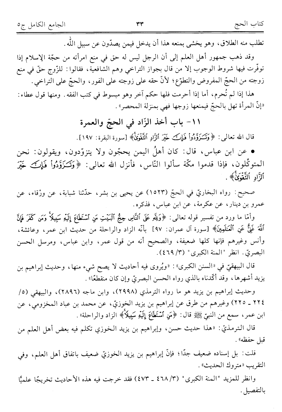 وأمّا ما ورد من تفسير قوله تعالى: {وَلِلَّهِ عَلَى النَّاسِ حِجُّ الْبَيْتِ مَنِ اسْتَطَاعَ إِلَيْهِ سَبِيلًا وَمَنْ كَفَرَ فَإِنَّ اللَّهَ غَنِيٌّ عَنِ الْعَالَمِينَ} [سورة آل عمران: ٩٧] بأنّه الزاد والراحلة من حديث ابن عمر، وعائشة، وأنس وغيرهم فإنها كلها ضعيفة، والصحيح أنه من قول عمر، وابن عباس، ومرسل الحسن البصريّ. انظر "المنة الكبرى" (٣/ ٤٦٩).