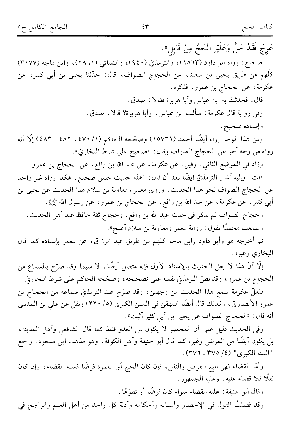 صحيح: رواه أبو داود (١٨٦٣)، والترمذيّ (٩٤٠)، والنسائي (٢٨٦١)، وابن ماجه (٣٠٧٧) كلّهم من طريق يحيى بن سعيد، عن الحجاج الصواف، قال: حدّثنا يحيى بن أبي كثير، عن عكرمة، عن الحجاج بن عمرو، فذكره.