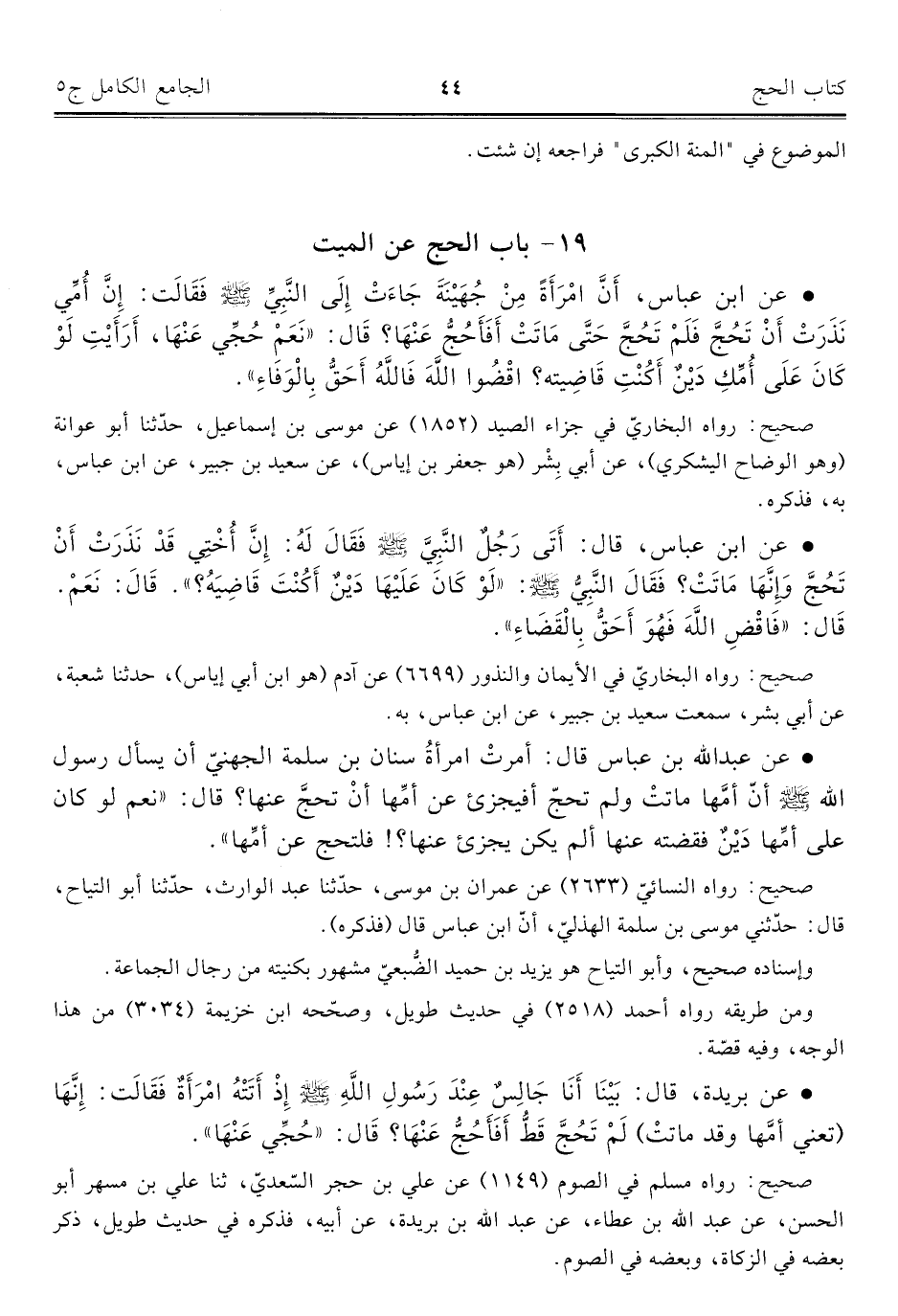 • عن عبد الله بن عباس قال: أمرتْ امرأةُ سنان بن سلمة الجهنيّ أن يسأل رسول الله - صلى الله عليه وسلم - أنّ أمَّها ماتتْ ولم تحجّ أفيجزئ عن أمِّها أنْ تحجَّ عنها؟ قال: "نعم لو كان على أمِّها دَيْنٌ فقضته عنها ألم يكن يجزئ عنها؟ ! فلتحج عن أمِّها".