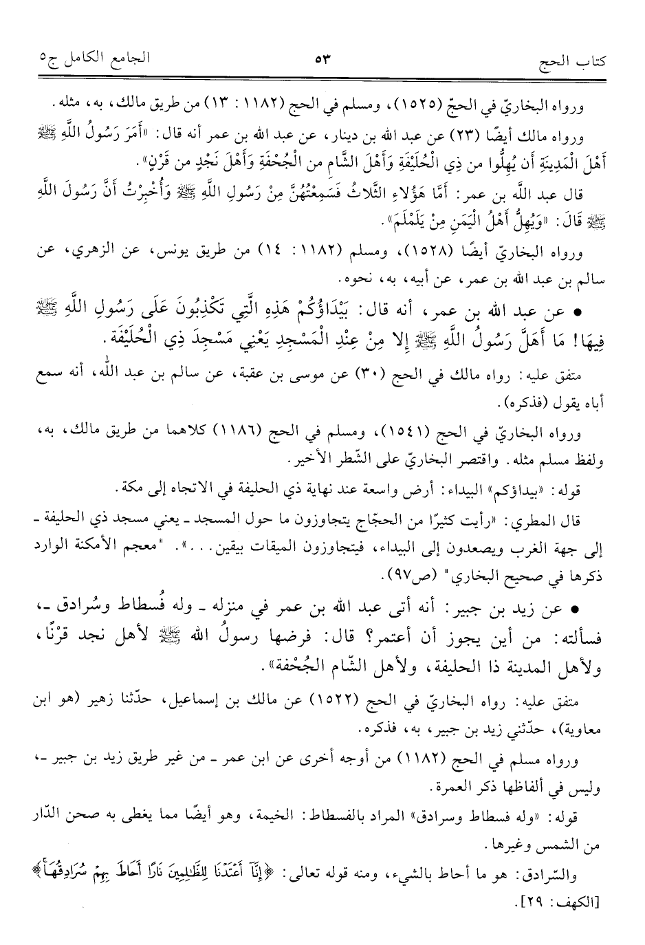 • عن زيد بن جبير: أنه أتي عبد الله بن عمر في منزله -وله فُسطاط وسُرادق-، فسألته: من أين يجوز أن أعتمر؟ قال: فرضها رسولُ الله - صلى الله عليه وسلم - لأهل نجد قرْنًا، ولأهل المدينة ذا الحليفة، ولأهل الشّام الجُحْفة".