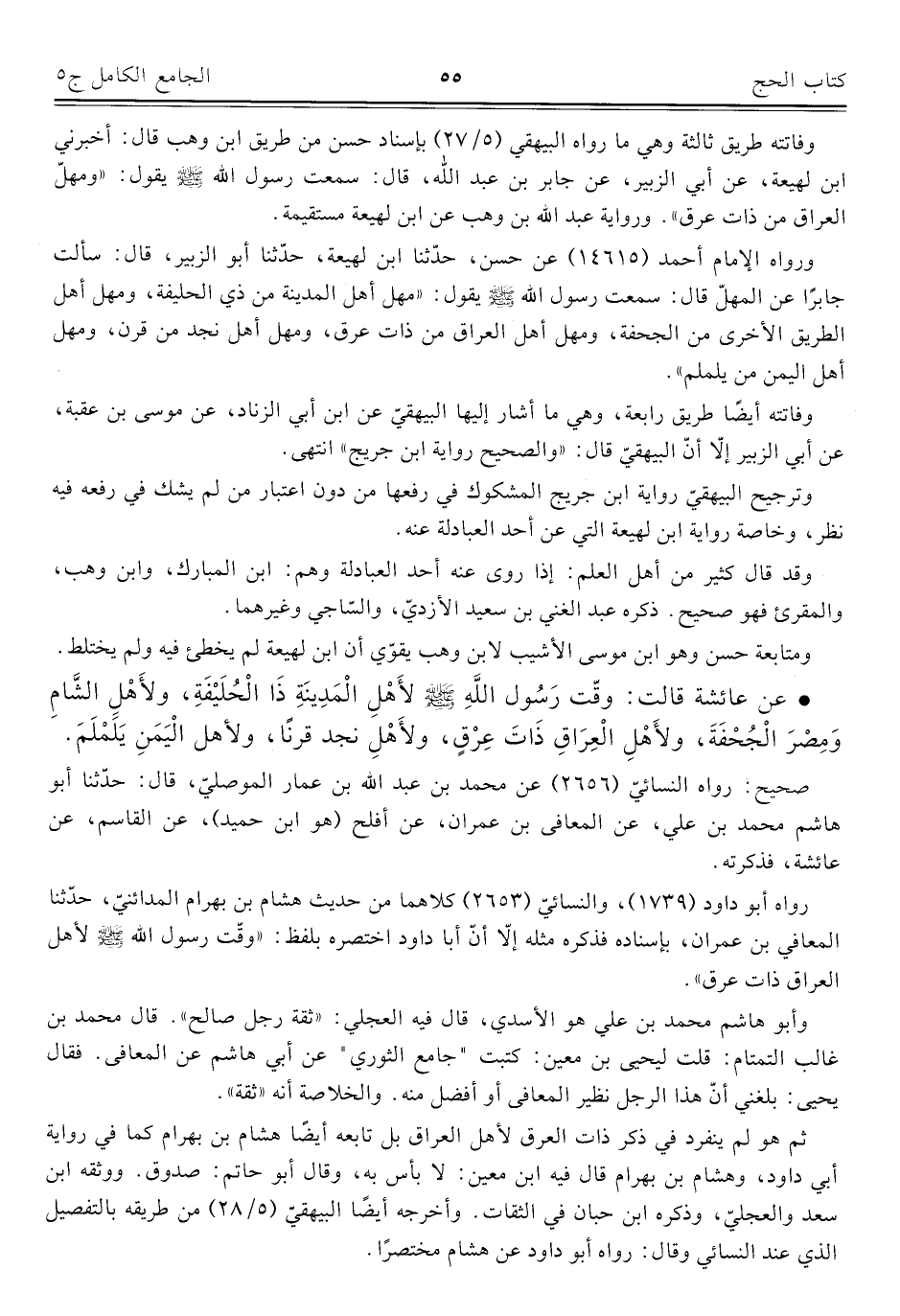 ثم هو لم ينفرد في ذكر ذات العرق لأهل العراق بل تابعه أيضًا هشام بن بهرام كما في رواية أبي داود، وهشام بن بهرام قال فيه ابن معين: لا بأس به، وقال أبو حاتم: صدوق. ووثقه ابن سعد والعجليّ، وذكره ابن حبان في الثقات. وأخرجه أيضًا البيهقيّ (٥/ ٢٨) من طريقه بالتفصيل الذي عند النسائي وقال: رواه أبو داود عن هشام مختصرًا.
