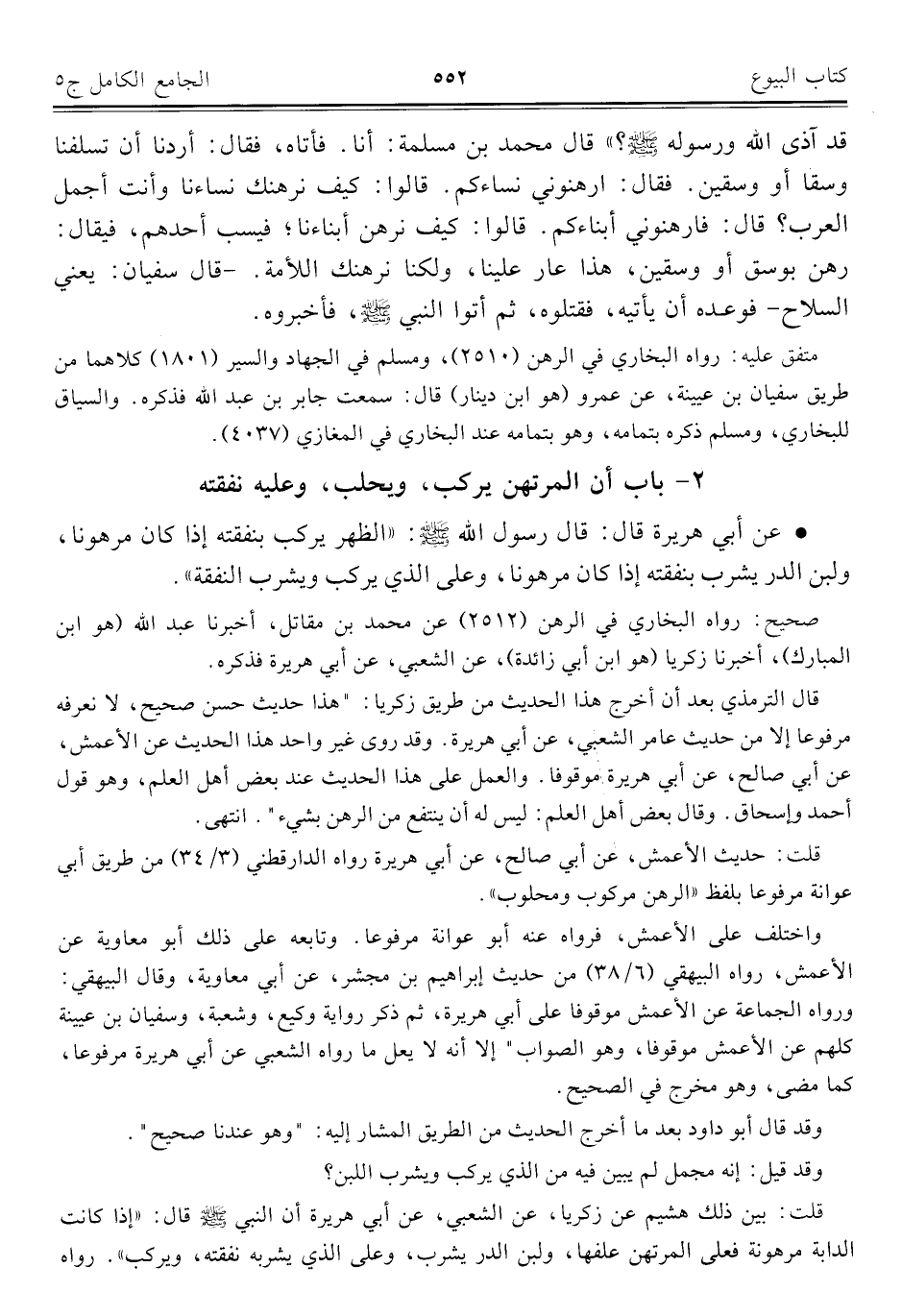 قال الترمذيّ بعد أن أخرج هذا الحديث من طريق زكريا: هذا حديث حسن صحيح، لا نعرفه مرفوعا إلا من حديث عامر الشعبي، عن أبي هريرة. وقد روى غير واحد هذا الحديث عن الأعمش، عن أبي صالح، عن أبي هريرة موقوفا. والعمل على هذا الحديث عند بعض أهل العلم، وهو قول أحمد وإسحاق. وقال بعض أهل العلم: ليس له أن ينتفع من الرهن بشيء". انتهى.