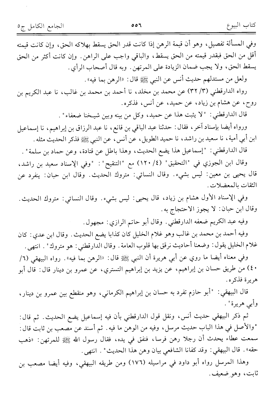 ثم ذكر البيهقي حديث أنس، ونقل قول الدارقطني بأن فيه إسماعيل يضع الحديث. ثم قال: "والأصل في هذا الباب حديث مرسل، وفيه من الوهن ما فيه. ثم أسند عن مصعب بن ثابت قال: سمعت عطاء يحدث أن رجلا رهن فرسا، فنفق في يده، فقال رسول اللَّه -صلى اللَّه عليه وسلم- للمرتهن: "ذهب حقه". قال البيهقي: وقد كفانا الشافعي بيان وهن هذا الحديث". انتهى.
