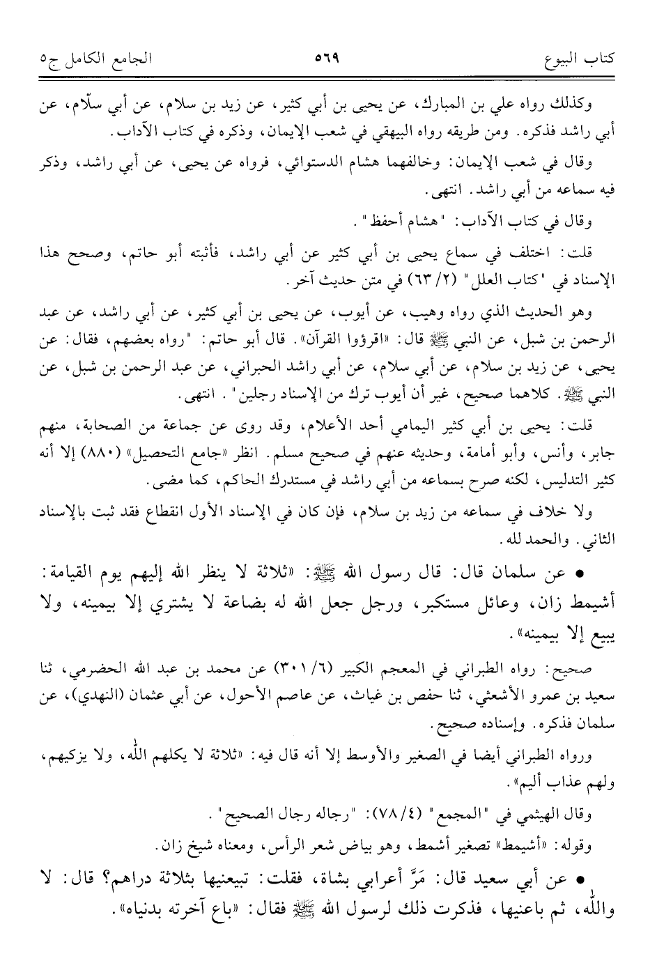 وكذلك رواه علي بن المبارك، عن يحيى بن أبي كثير، عن زيد بن سلام، عن أبي سلّام، عن أبي راشد فذكره. ومن طريقه رواه البيهقي في شعب الإيمان، وذكره في كتاب الآداب.