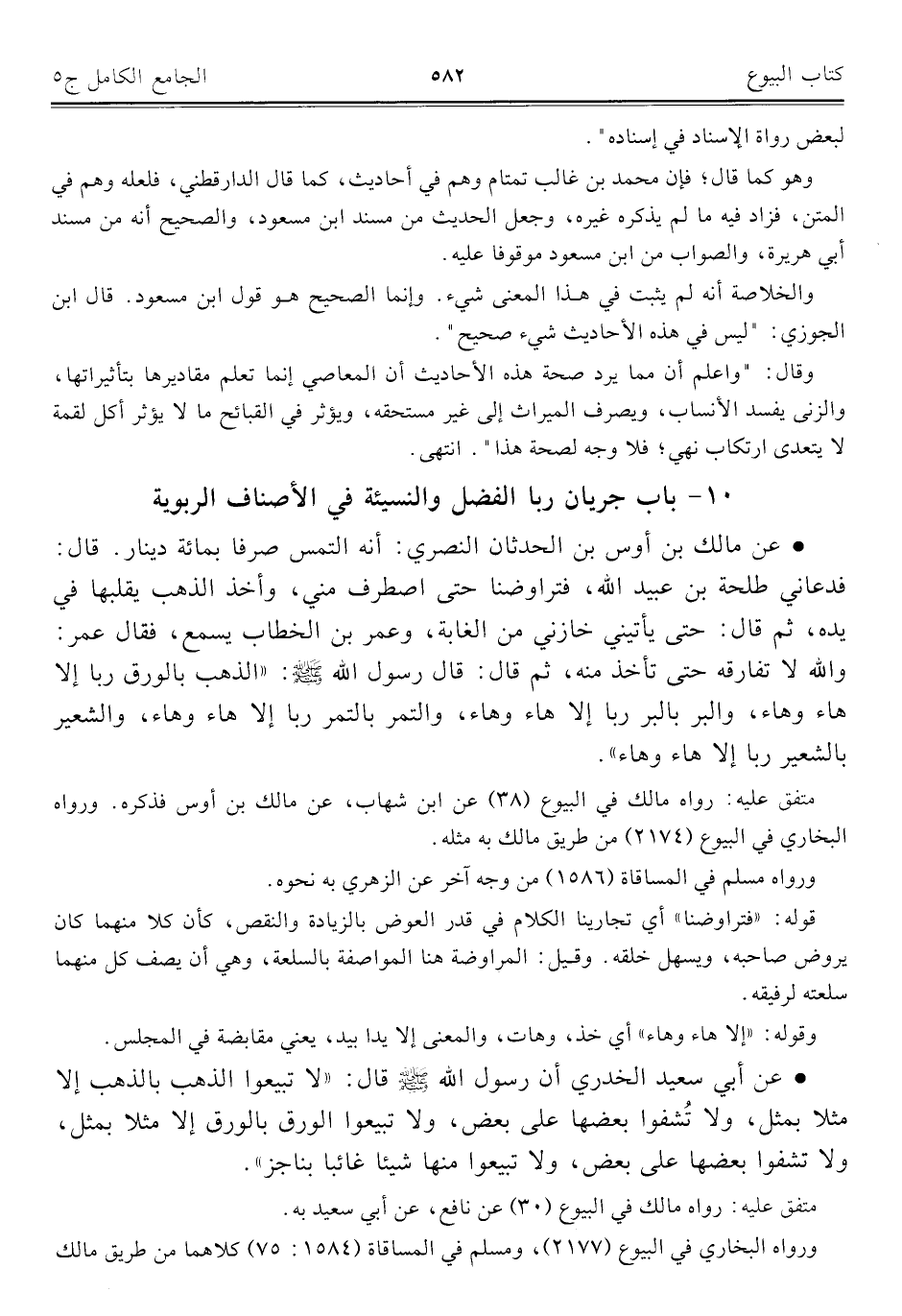 • عن مالك بن أوس بن الحدثان النصري: أنه التمس صرفا بمائة دينار. قال: فدعاني طلحة بن عبيد اللَّه، فتراوضنا حتى اصطرف مني، وأخذ الذهب يقلبها في يده، ثم قال: حتى يأتيني خازني من الغابة، وعمر بن الخطاب يسمع، فقال عمر: واللَّه لا تفارقه حتى تأخذ منه، ثم قال: قال رسول اللَّه -صلى اللَّه عليه وسلم-: "الذهب بالورق ربا إلا هاء وهاء، والبر بالبر ربا إلا هاء وهاء، والتمر بالتمر ربا إلا هاء وهاء، والشعير بالشعير ربا إلا هاء وهاء".