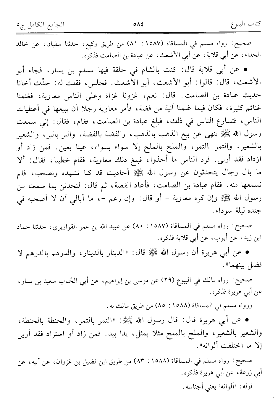 • عن أبي قلابة قال: كنت بالشام في حلقة فيها مسلم بن يسار، فجاء أبو الأشعث، قال: قالوا: أبو الأشعث، أبو الأشعث. فجلس، فقلت له: حدِّث أخانا حديث عبادة بن الصامت. قال: نعم، غزونا غزاة وعلى النّاس معاوية، فغنمنا غنائم كثيرة، فكان فيما غنمنا آنية من فضة، فأمر معاوية رجلا أن يبيعها في أعطيات النّاس، فتسارع النّاس في ذلك، فبلغ عبادة بن الصامت، فقام، فقال: إني سمعت رسول اللَّه -صلى اللَّه عليه وسلم- ينهى عن بيع الذهب بالذهب، والفضة بالفضة، والبر بالبر، والشعير بالشعير، والتمر بالتمر، والملح بالملح إلا سواء بسواء، عينا بعين. فمن زاد أو ازداد فقد أربى. فرد النّاس ما أخذوا، فبلغ ذلك معاوية، فقام خطيبا، فقال: ألا ما بال رجال يتحدثون عن رسول اللَّه -صلى اللَّه عليه وسلم- أحاديث قد كنا نشهده ونصحبه، فلم نسمعها منه. فقام عبادة بن الصامت، فأعاد القصة، ثم قال: لنحدثن بما سمعنا من رسول اللَّه -صلى اللَّه عليه وسلم-، وإن كره معاوية -أو قال: وإن رغم-، ما أبالي أن لا أصحبه في جنده ليلة سوداء.