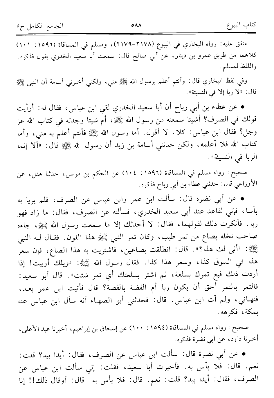 • عن عطاء بن أبي رباح أن أبا سعيد الخدري لقي ابن عباس، فقال له: أرأيت قولك في الصرف؟ أشيئا سمعته من رسول اللَّه -صلى اللَّه عليه وسلم-، أم شيئًا وجدته في كتاب اللَّه عز وجل؟ فقال ابن عباس: كلا، لا أقول. أما رسول اللَّه -صلى اللَّه عليه وسلم- فأنتم أعلم به مني، وأما كتاب اللَّه فلا أعلمه، ولكن حدثني أسامة بن زيد أن رسول اللَّه -صلى اللَّه عليه وسلم- قال: "ألا إنما الربا في النسيئة".