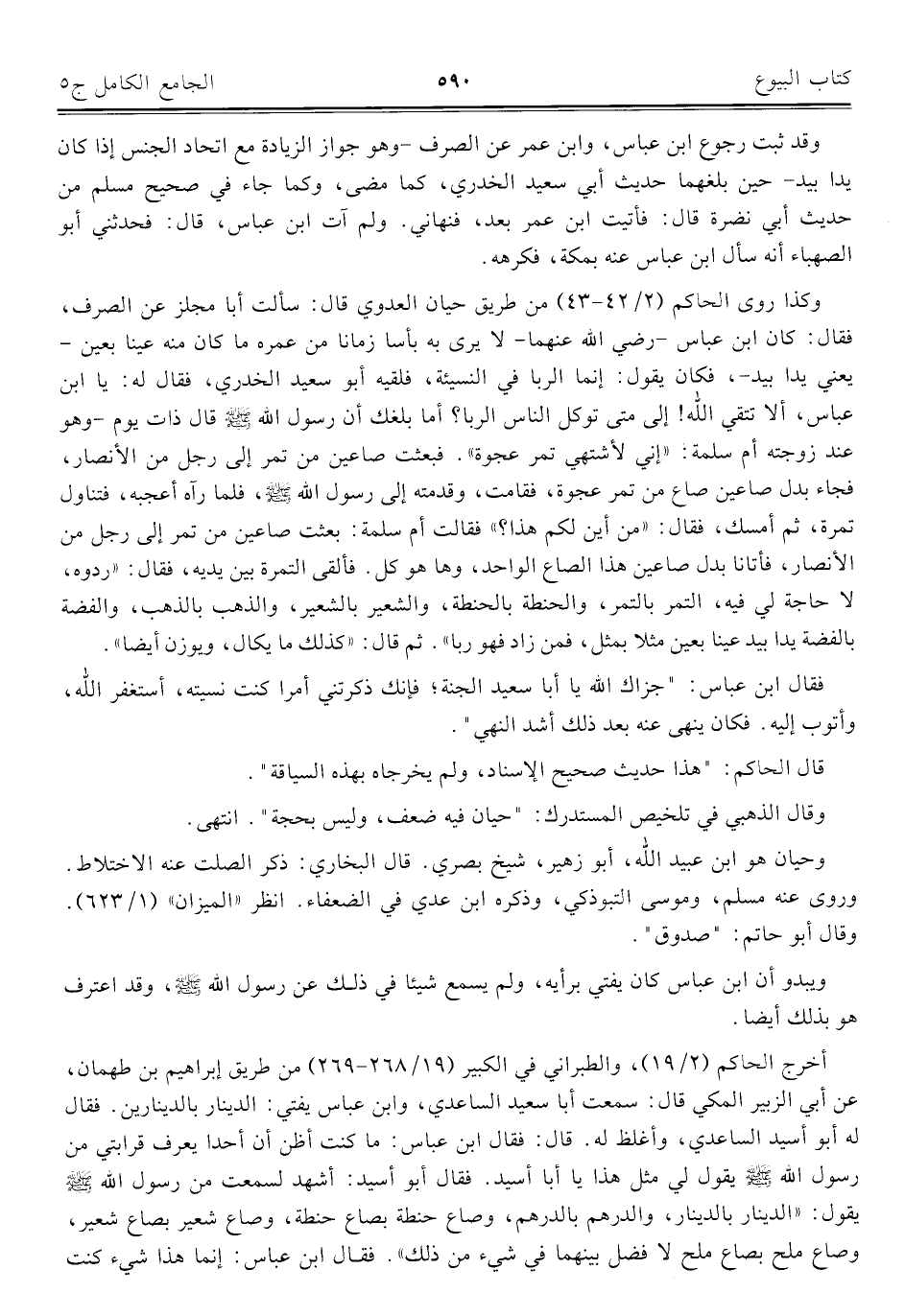 وكذا روى الحاكم (٢/ ٤٢ - ٤٣) من طريق حيان العدوي قال: سألت أبا مجلز عن الصرف، فقال: كان ابن عباس -رضي اللَّه عنهما- لا يرى به بأسا زمانا من عمره ما كان منه عينا بعين -يعني يدا بيد-، فكان يقول: إنما الربا في النسيئة، فلقيه أبو سعيد الخدري، فقال له: يا ابن عباس، ألا تتقي اللَّه! إلى متى توكل النّاس الربا؟ أما بلغك أن رسول اللَّه -صلى اللَّه عليه وسلم- قال ذات يوم - وهو عند زوجته أم سلمة: "إني لأشتهي تمر عجوة". فبعثت صاعين من تمر إلى رجل من الأنصار، فجاء بدل صاعين صاع من تمر عجوة، فقامت، وقدمته إلى رسول اللَّه -صلى اللَّه عليه وسلم-، فلما رآه أعجبه، فتناول تمرة، ثم أمسك، فقال: "من أين لكم هذا؟ " فقالت أم سلمة: بعثت صاعين من تمر إلى رجل من الأنصار، فأتانا بدل صاعين هذا الصاع الواحد، وها هو كل. فألقى التمرة بين يديه، فقال: "ردوه، لا حاجة لي فيه، التمر بالتمر، والحنطة بالحنطة، والشعير بالشعير، والذهب بالذهب، والفضة بالفضة يدا بيد عينا بعين مثلا بمثل، فمن زاد فهو ربا". ثم قال: "كذلك ما يكال، ويوزن أيضًا".
