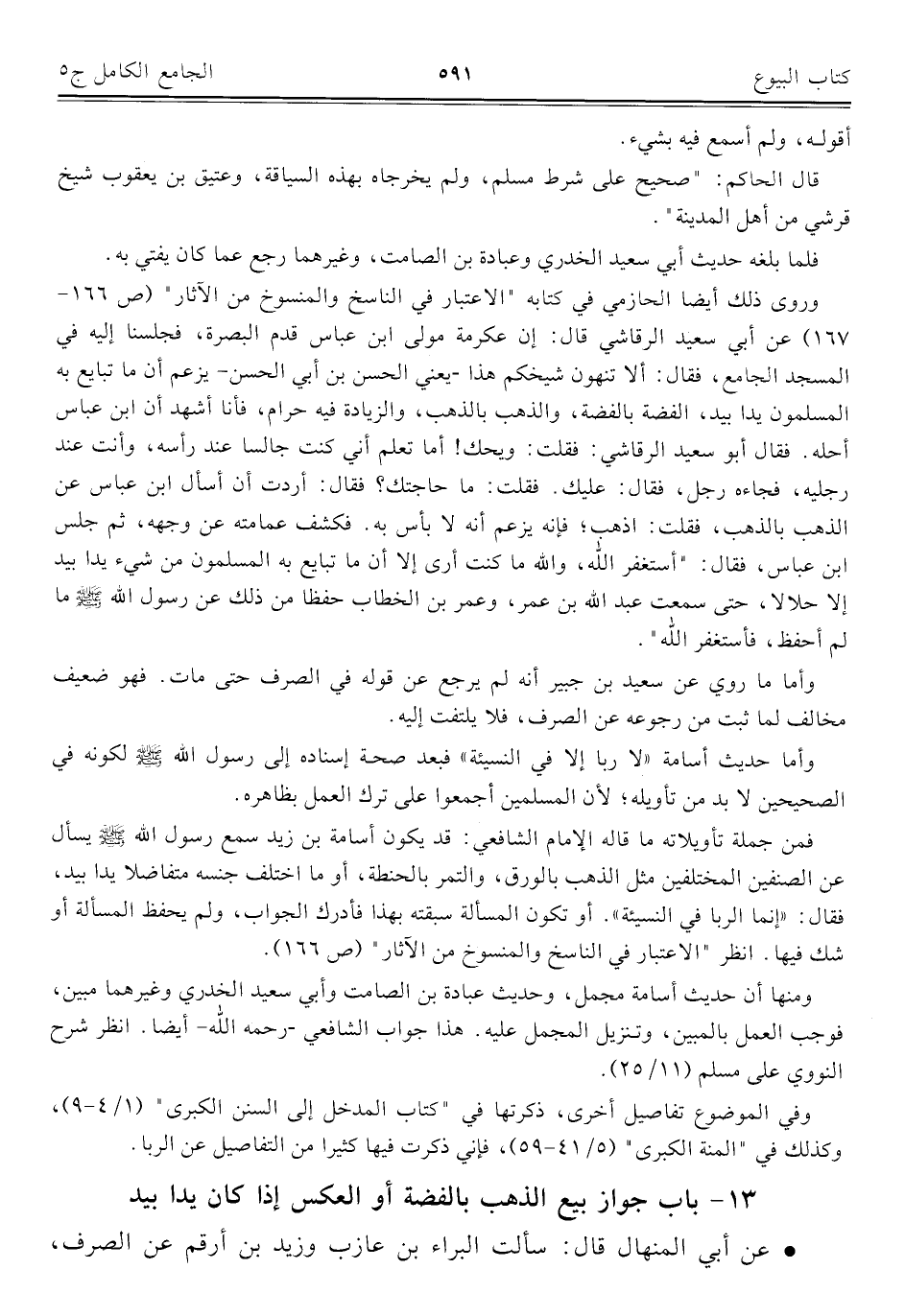 ومنها أن حديث أسامة مجمل، وحديث عبادة بن الصامت وأبي سعيد الخدري وغيرهما مبين، فوجب العمل بالمبين، وتنزيل المجمل عليه. هذا جواب الشافعي -رحمه اللَّه- أيضًا. انظر شرح النووي على مسلم (١١/ ٢٥).