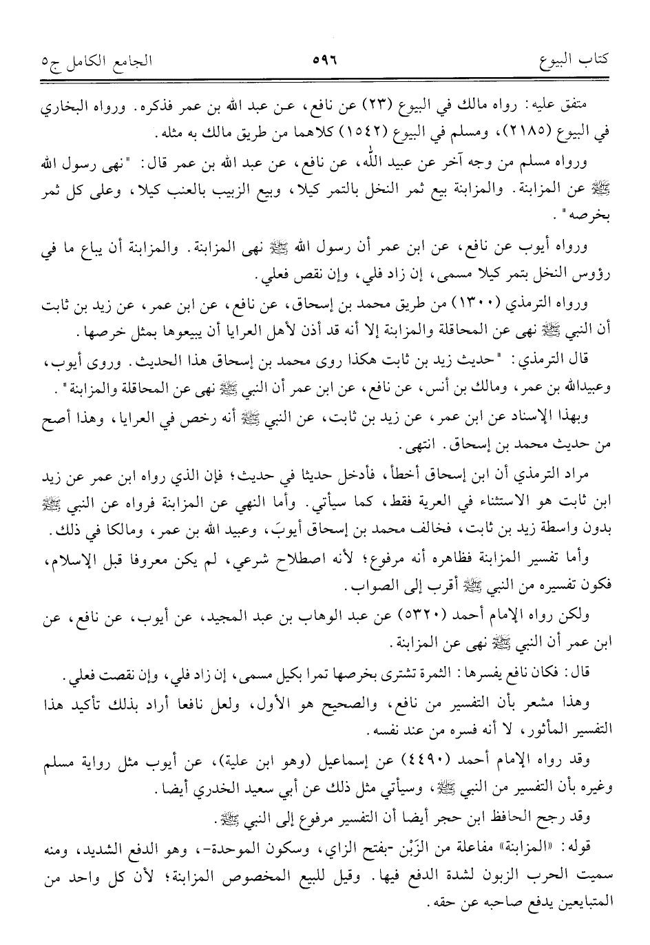 قال الترمذيّ: "حديث زيد بن ثابت هكذا روى محمد بن إسحاق هذا الحديث. وروى أيوب، وعبيد اللَّه بن عمر، ومالك بن أنس، عن نافع، عن ابن عمر أن النبي -صلى اللَّه عليه وسلم- نهى عن المحاقلة والمزابنة".