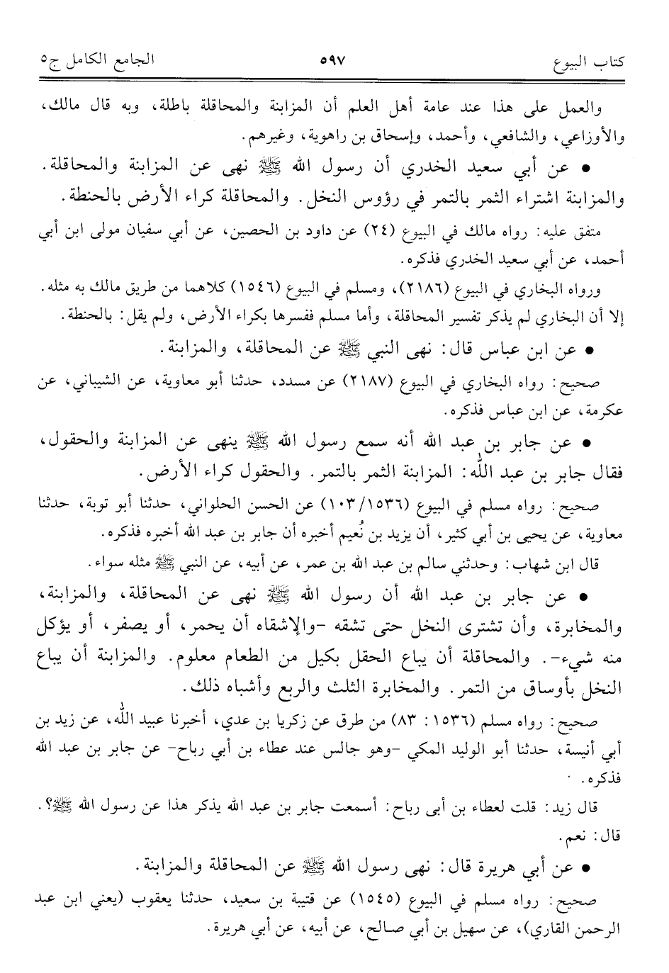• عن جابر بن عبد اللَّه أنه سمع رسول اللَّه -صلى اللَّه عليه وسلم- ينهى عن المزابنة والحقول، فقال جابر بن عبد اللَّه: المزابنة الثمر بالتمر. والحقول كراء الأرض.