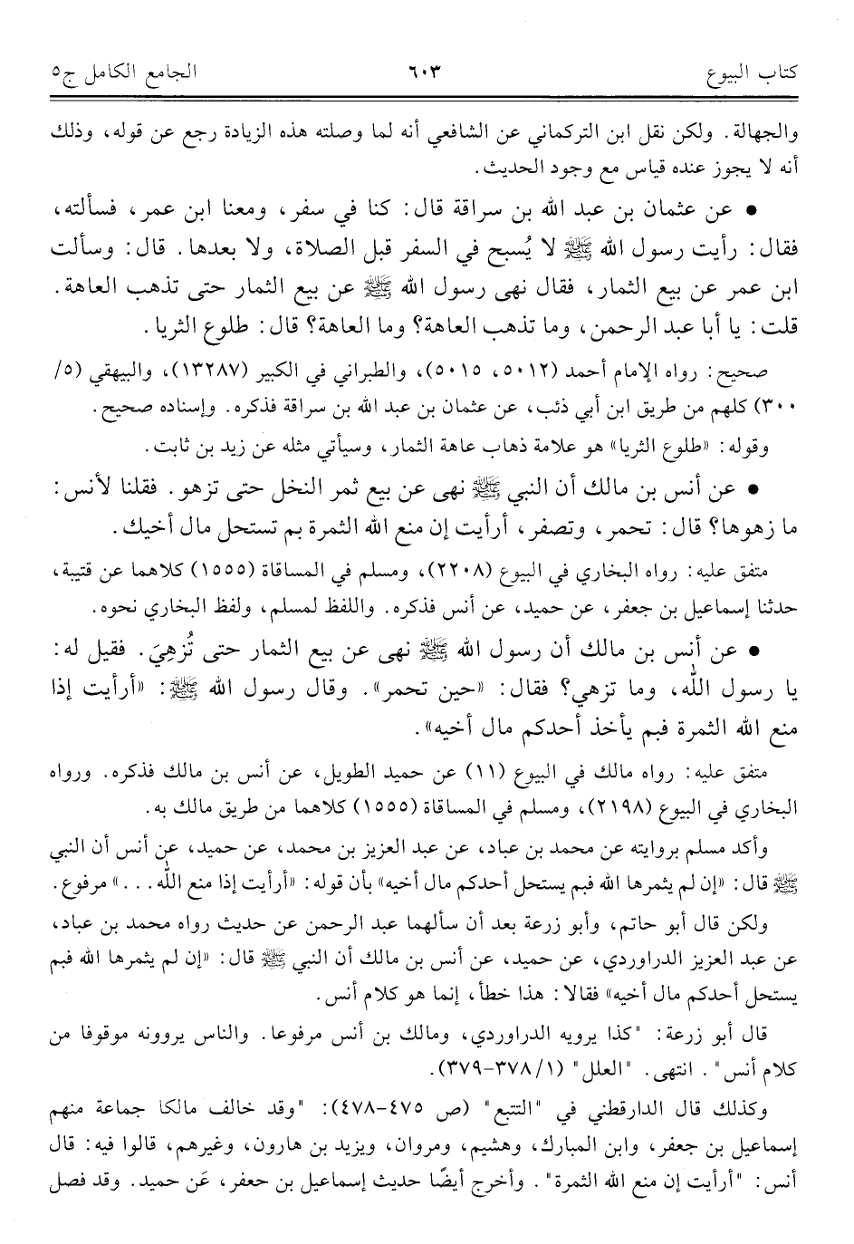 • عن عثمان بن عبد اللَّه بن سراقة قال: كنا في سفر، ومعنا ابن عمر، فسألته، فقال: رأيت رسول اللَّه -صلى اللَّه عليه وسلم- لا يُسبح في السفر قبل الصلاة، ولا بعدها. قال: وسألت ابن عمر عن بيع الثمار، فقال نهى رسول اللَّه -صلى اللَّه عليه وسلم- عن بيع الثمار حتى تذهب العاهة. قلت: يا أبا عبد الرحمن، وما تذهب العاهة؟ وما العاهة؟ قال: طلوع الثريا.