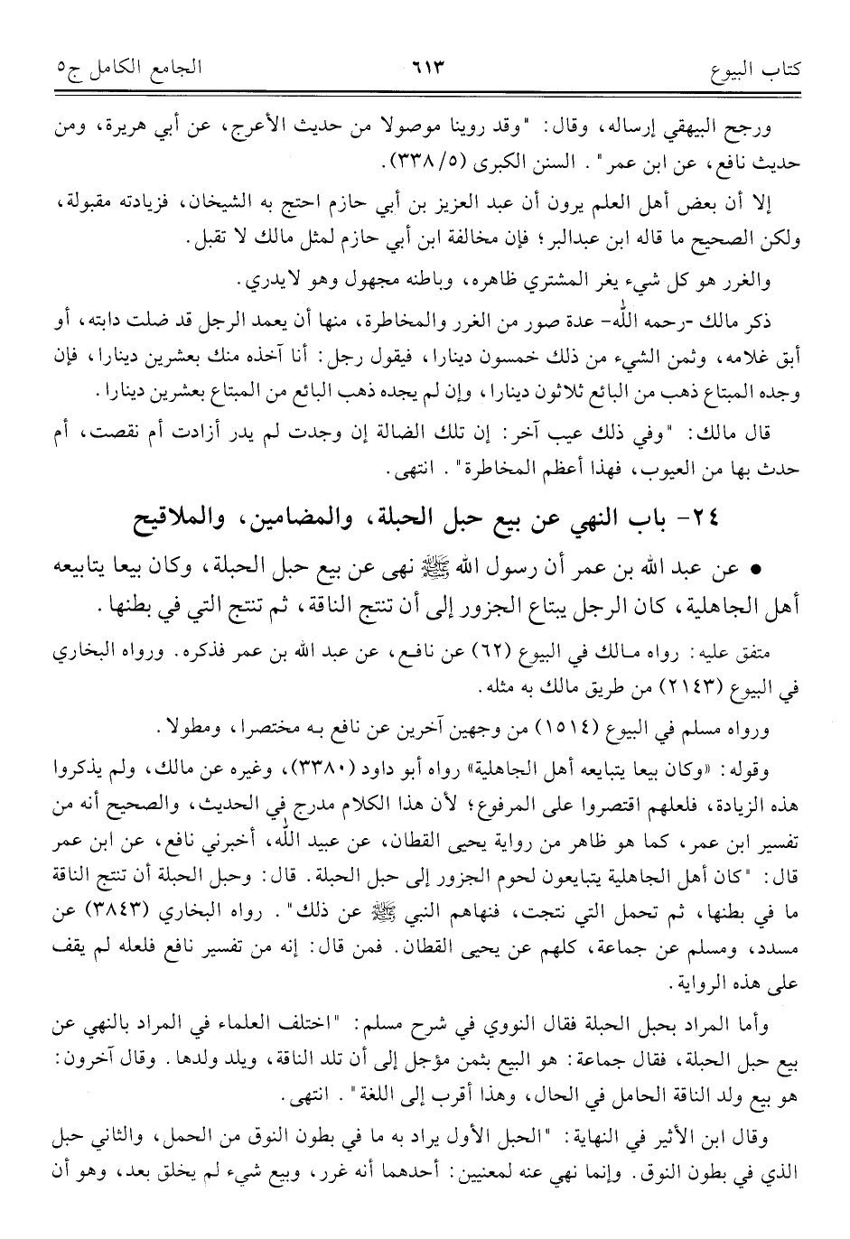 وقوله: "وكان بيعا يتبايعه أهل الجاهلية" رواه أبو داود (٣٣٨٠)، وغيره عن مالك، ولم يذكروا هذه الزيادة، فلعلهم اقتصروا على المرفوع؛ لأن هذا الكلام مدرج في الحديث، والصحيح أنه من تفسير ابن عمر، كما هو ظاهر من رواية يحيى القطان، عن عبيد اللَّه، أخبرني نافع، عن ابن عمر قال: "كان أهل الجاهلية يتبايعون لحوم الجزور إلى حبل الحبلة. قال: وحبل الحبلة أن تتج الناقة ما في بطنها، ثم تحمل التي نتجت، فنهاهم النبي -صلى اللَّه عليه وسلم- عن ذلك". رواه البخاري (٣٨٤٣) عن مسدد، ومسلم عن جماعة، كلهم عن يحيى القطان. فمن قال: إنه من تفسير نافع فلعله لم يقف على هذه الرواية.