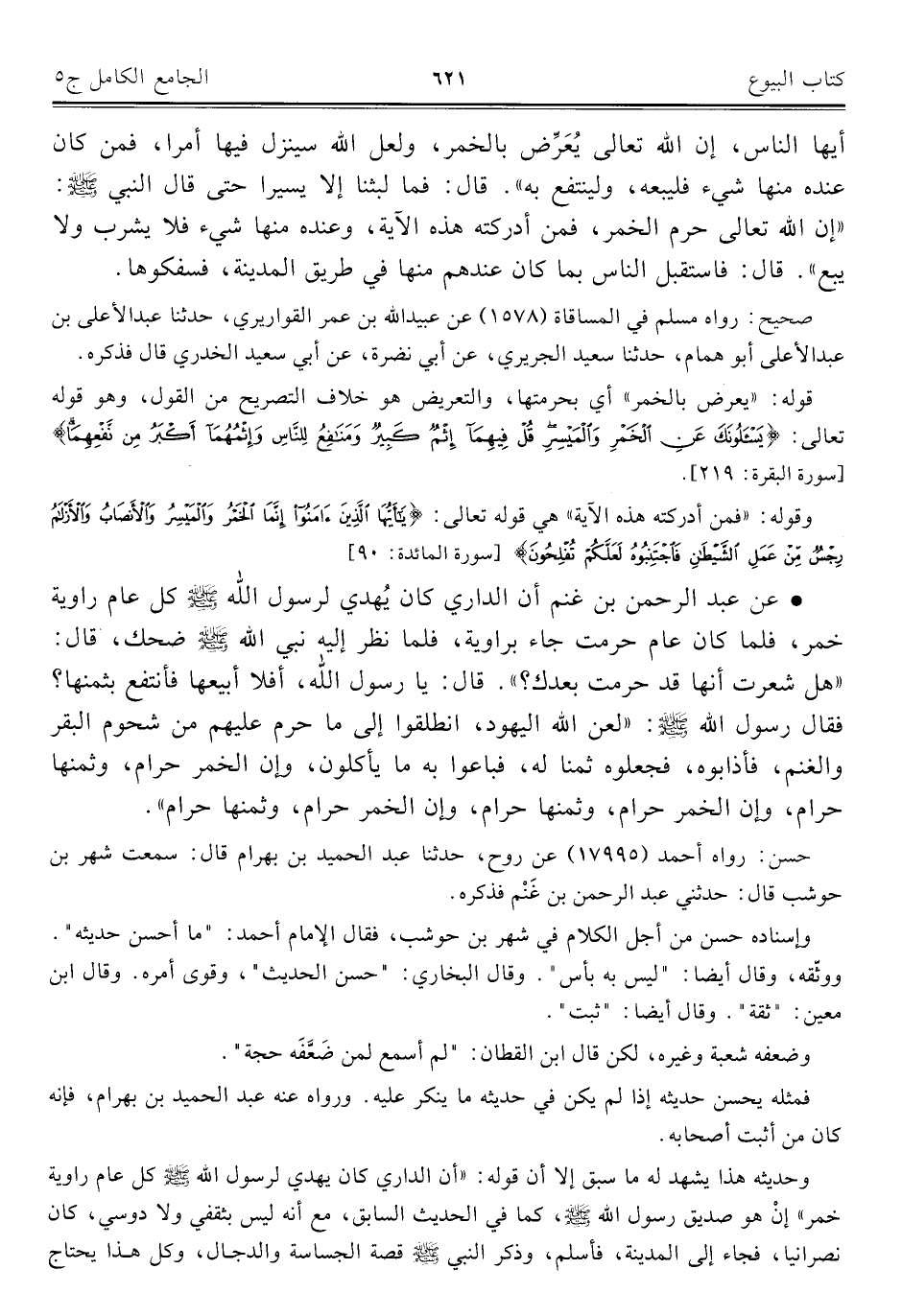 • عن عبد الرحمن بن غنم أن الداري كان يُهدي لرسول اللَّه -صلى اللَّه عليه وسلم- كل عام راوية خمر، فلما كان عام حرمت جاء براوية، فلما نظر إليه نبي اللَّه -صلى اللَّه عليه وسلم- ضحك، قال: "هل شعرت أنها قد حرمت بعدك؟ ". قال: يا رسول اللَّه، أفلا أبيعها فأنتفع بثمنها؟ فقال رسول اللَّه -صلى اللَّه عليه وسلم-: "لعن اللَّه اليهود، انطلقوا إلى ما حرم عليهم من شحوم البقر والغنم، فأذابوه، فجعلوه ثمنا له، فباعوا به ما يأكلون، وإن الخمر حرام، وثمنها حرام، وإن الخمر حرام، وثمنها حرام، وإن الخمر حرام، وثمنها حرام".