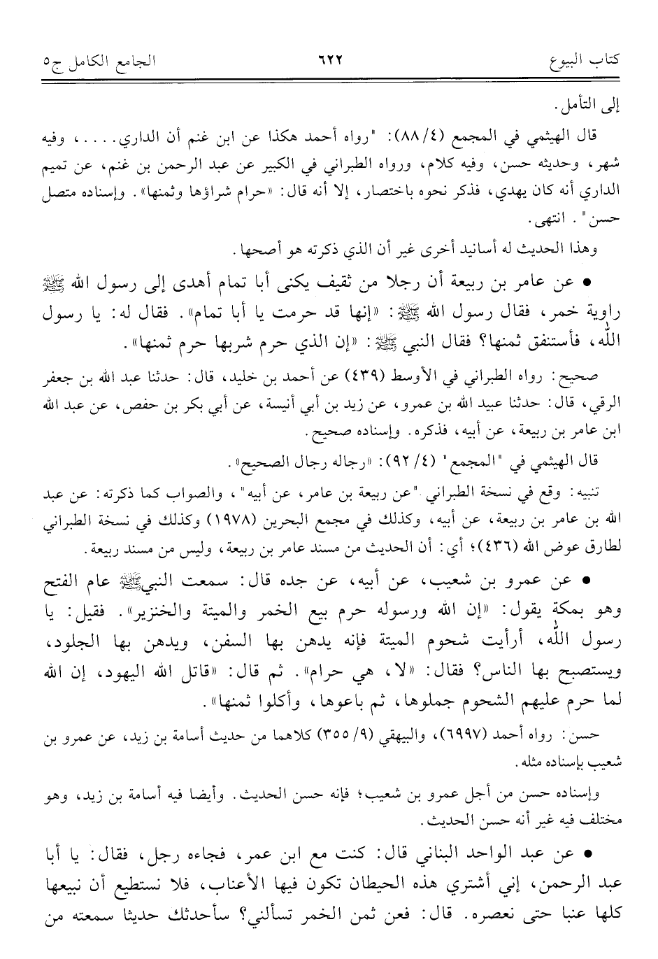 • عن عامر بن ربيعة أن رجلًا من ثقيف يكنى أبا تمام أهدى إلى رسول اللَّه -صلى اللَّه عليه وسلم- راوية خمر، فقال رسول اللَّه -صلى اللَّه عليه وسلم-: "إنها قد حرمت يا أبا تمام". فقال له: يا رسول اللَّه، فأستنفق ثمنها؟ فقال النبي -صلى اللَّه عليه وسلم-: "إن الذي حرم شربها حرم ثمنها".