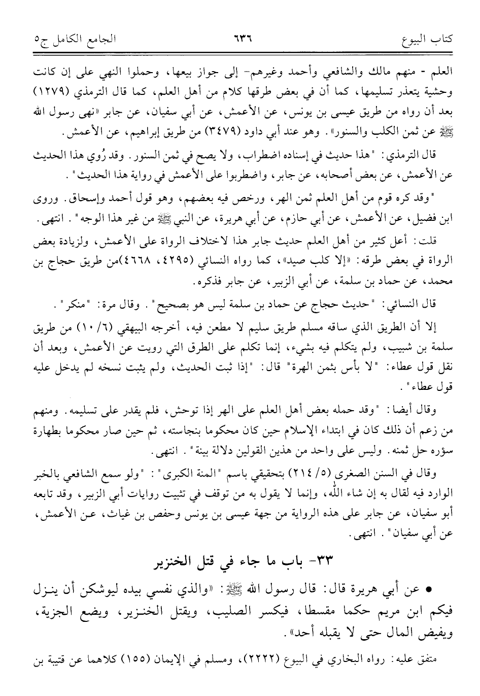 وقال في السنن الصغرى (٥/ ٢١٤) بتحقيقي باسم "المنة الكبرى": "ولو سمع الشافعي بالخبر الوارد فيه لقال به إن شاء اللَّه، وإنما لا يقول به من توقف في تثبيت روايات أبي الزبير، وقد تابعه أبو سفيان، عن جابر على هذه الرواية من جهة عيسى بن يونس وحفص بن غياث، عن الأعمش، عن أبي سفيان". انتهى.