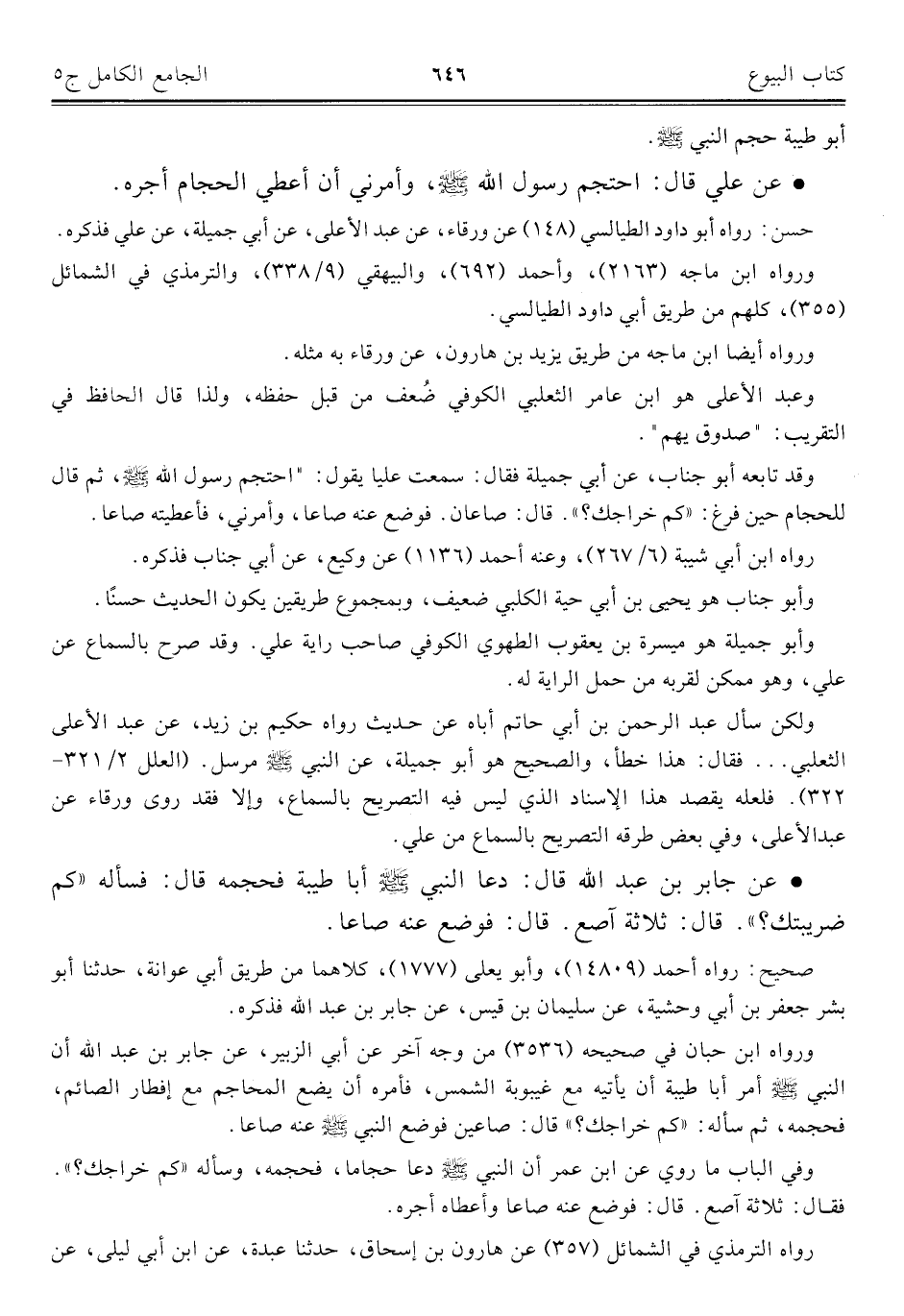 وقد تابعه أبو جناب، عن أبي جميلة فقال: سمعت عليا يقول: "احتجم رسول اللَّه -صلى اللَّه عليه وسلم-، ثم قال للحجام حين فرغ: "كم خراجك؟ ". قال: صاعان. فوضع عنه صاعا، وأمرني، فأعطيته صاعا.