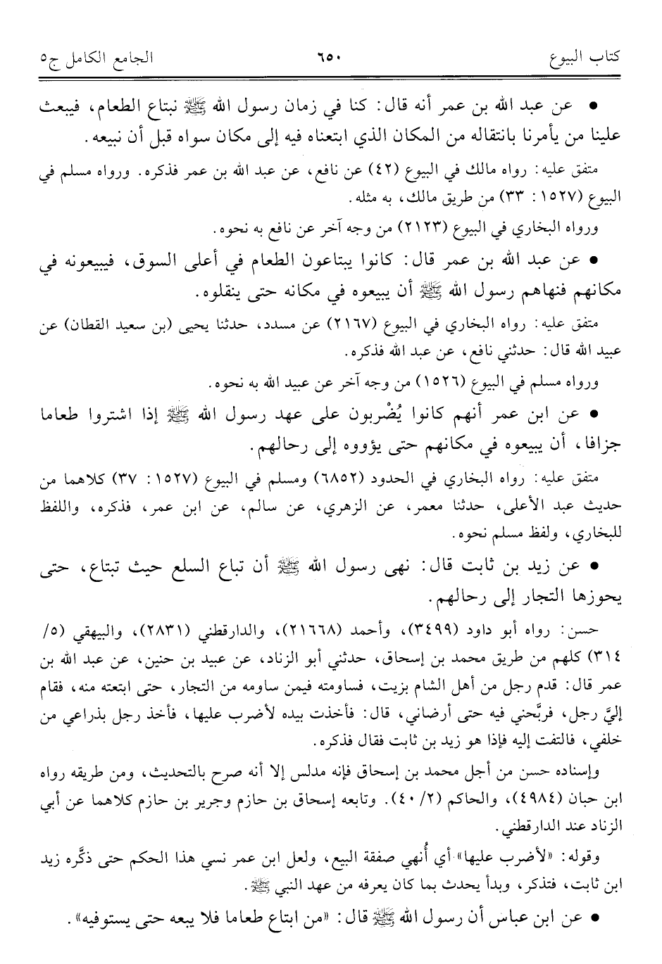• عن عبد اللَّه بن عمر قال: كانوا يبتاعون الطعام في أعلى السوق، فيبيعونه في مكانهم فنهاهم رسول اللَّه -صلى اللَّه عليه وسلم- أن يبيعوه في مكانه حتى ينقلوه.