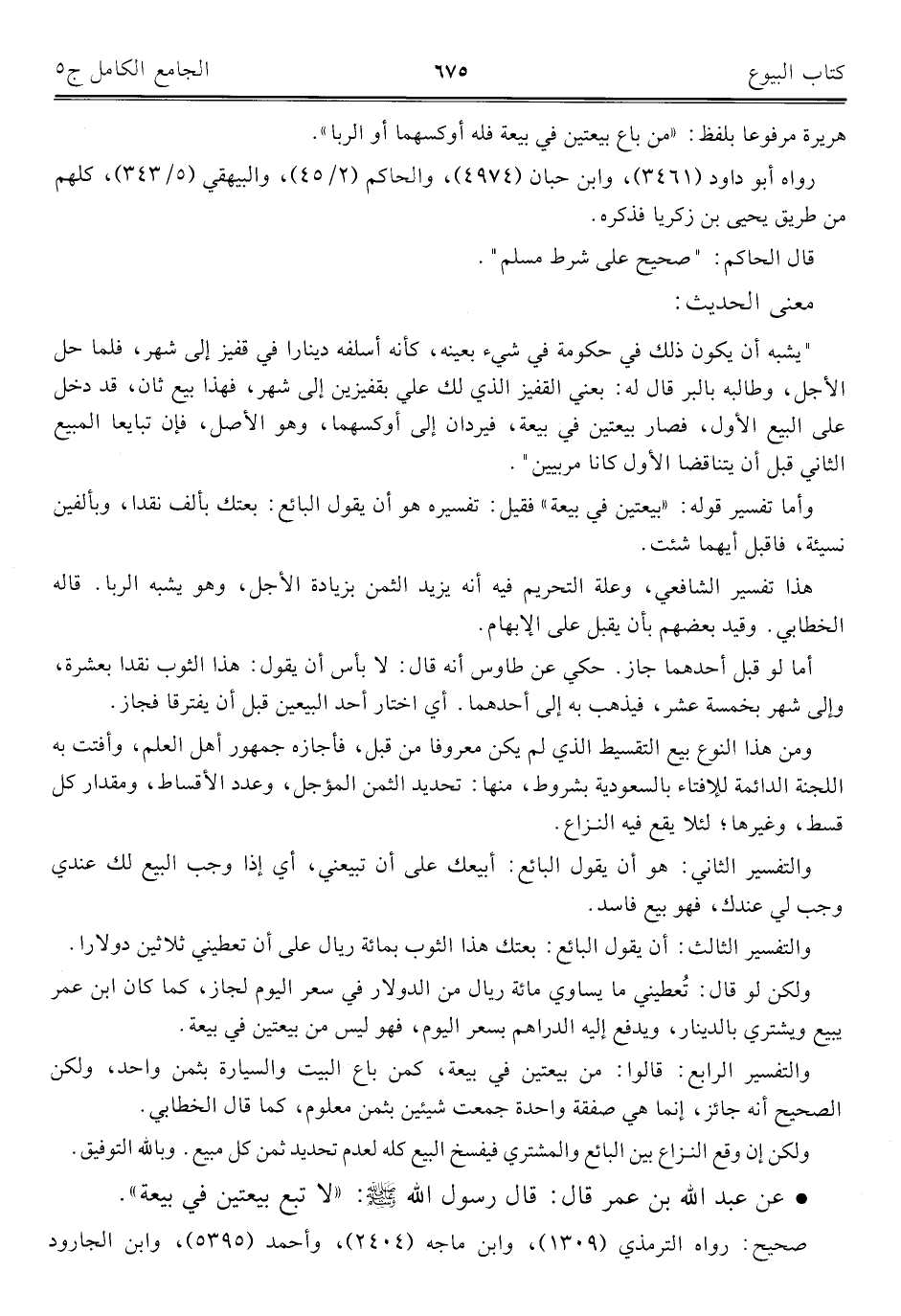• عن عبد اللَّه بن عمر قال: قال رسول اللَّه -صلى اللَّه عليه وسلم-: "لا تبع بيعتين في بيعة".