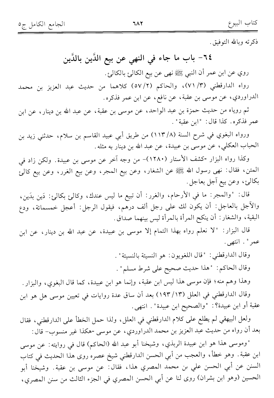 "وموسى هذا هو ابن عبيدة الربذي، وشيخنا أبو عبد اللَّه (الحاكم) قال في روايته: عن موسى ابن عقبة. وهو خطأ، والعجب من أبي الحسن الدارقطني شيخ عصره روى هذا الحديث في كتاب السنن عن أبي الحسن علي بن محمد المصري هذا، فقال: عن موسى بن عقبة. وشيخنا أبو الحسين (وهو ابن بشران) روى لنا عن أبي الحسن المصري في الجزء الثالث من سنن المصري،