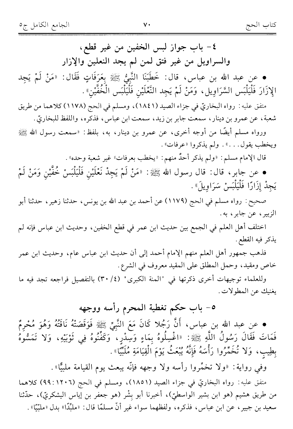• عن عبد الله بن عباس، قال: خَطَبَنَا النَّبِيُّ - صلى الله عليه وسلم - بَعَرَفَاتٍ فَقَالَ: "مَنْ لَمْ يَجِد الإِزَارَ فَلَيَلْبَس السَّرَاوِيل، وَمَنْ لَمْ يَجِد النَّعْلَيْنِ فَلْيَلْبَس الْخُفَّيْنِ".