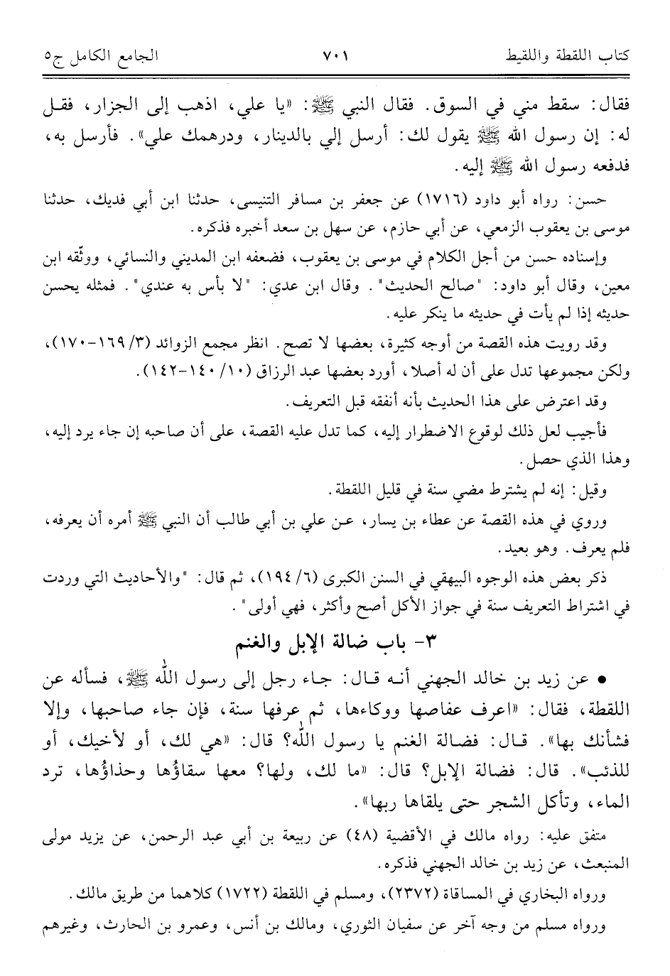 • عن زيد بن خالد الجهني أنه قال: جاء رجل إلى رسول اللَّه -صلى اللَّه عليه وسلم-، فسأله عن اللقطة، فقال: "اعرف عقاصها ووكاءها، ثم عرفها سنة، فإن جاء صاحبها، وإلا فشأنك بها". قال: فضالة الغنم يا رسول اللَّه؟ قال: هي لك، أو لأخيك، أو للذئب". قال: فضالة الإبل؟ قال: ما لك، ولها؟ معها سقاؤُها وحذاؤُها، ترد الماء، وتأكل الشجر حتى يلقاها ربها".