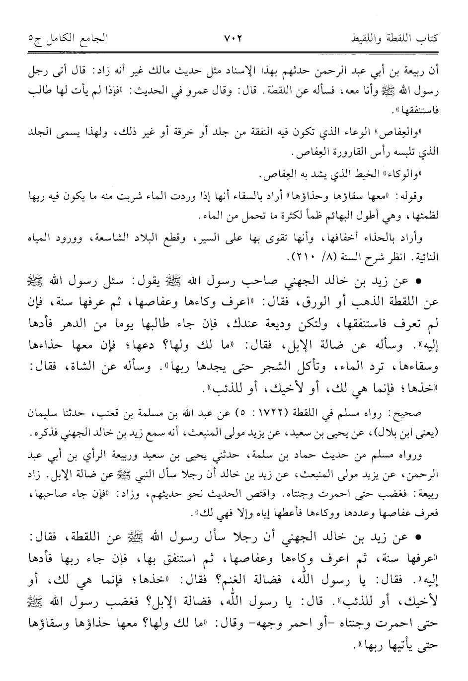 • عن زيد بن خالد الجهني أن رجلا سأل رسول اللَّه -صلى اللَّه عليه وسلم- عن اللقطة، فقال: "عرفها سنة، ثم اعرف وكاءها وعناصها، ثم استنفق بها، فإن جاء ربها فأدها إليه". فقال: يا رسول اللَّه، فضالة الغنم؟ فقال: "خذها؛ فإنما هي لك، أو لأخيك، أو للذئب". قال: يا رسول اللَّه، فضالة الإبل؟ فغضب رسول اللَّه -صلى اللَّه عليه وسلم- حتى احمرت وجنتاه -أو احمر وجهه- وقال: "ما لك ولها؟ معها حذاؤها وسقاؤها حتى يأتيها ربها".