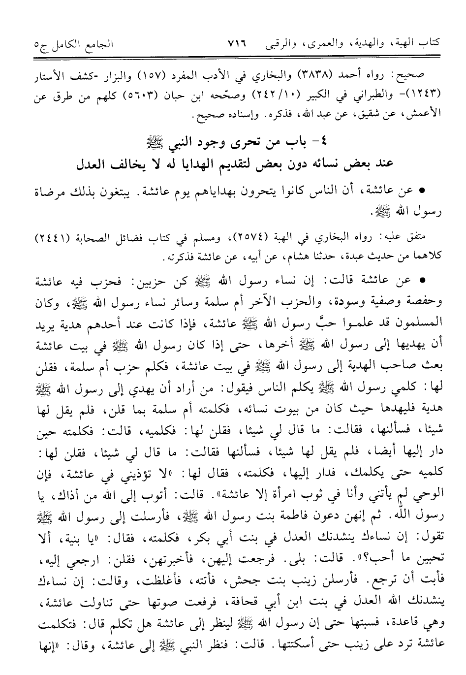 ٤ - باب من تحرى وجود النبي -صلى اللَّه عليه وسلم- عند بعض نسائه دون بعض التقديم الهدايا له لا يخالف العدل