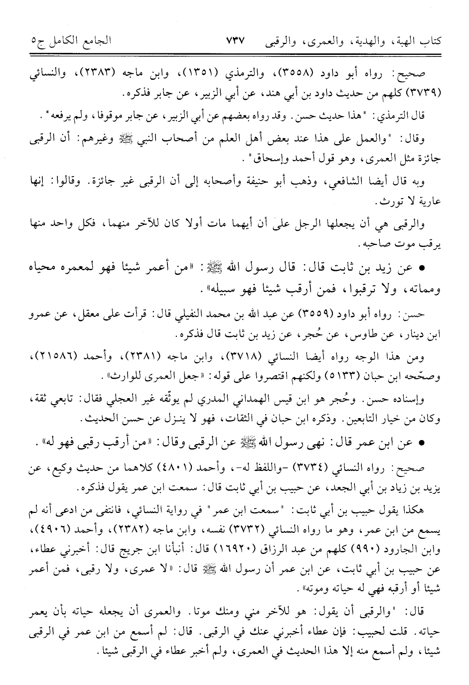 • عن زيد بن ثابت قال: قال رسول اللَّه -صلى اللَّه عليه وسلم-: "من أعمر شيئًا فهو لمعمره محياه ومماته، ولا ترقبوا، فمن أرقب شيئًا فهو سبيله".