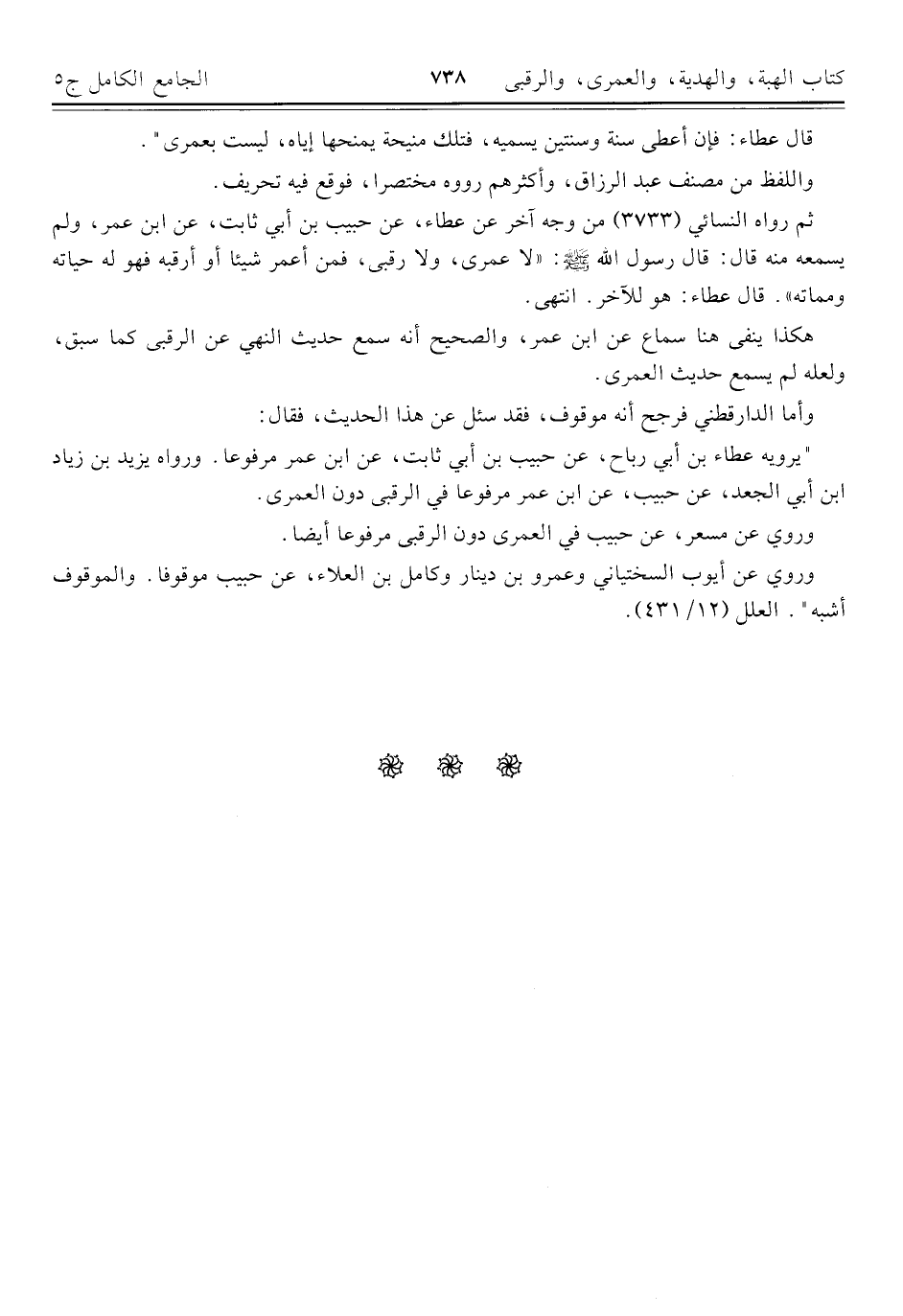 ثم رواه النسائي (٣٧٣٣) من وجه آخر عن عطاء، عن حبيب بن أبي ثابت، عن ابن عمر، ولم يسمعه منه قال: قال رسول اللَّه -صلى اللَّه عليه وسلم-: "لا عمرى، ولا رقبى، فمن أعمر شيئًا أو أرقبه فهو له حياته ومماته". قال عطاء: هو للآخر. انتهى.