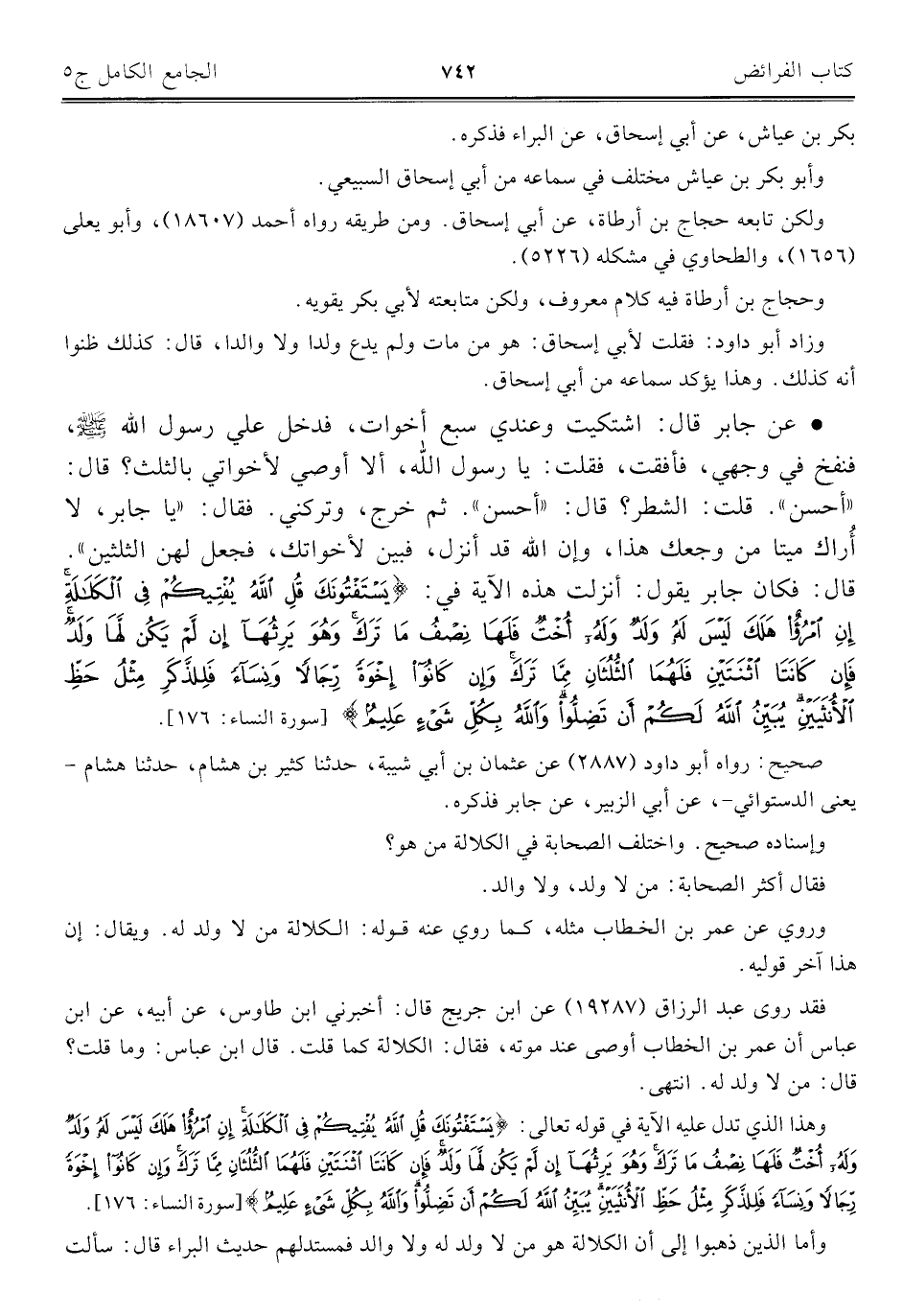 • عن جابر قال: اشتكيت وعندي سبع أخوات، فدخل علي رسول اللَّه -صلى اللَّه عليه وسلم-، فنفخ في وجهي، فأفقت، فقلت: يا رسول اللَّه، ألا أوصي لأخواتي بالثلث؟ قال: "أحسن". قلت: الشطر؟ قال: "أحسن". ثم خرج، وتركني. فقال: "يا جابر، لا أُراك ميتا من وجعك هذا، وإن اللَّه قد أنزل، فبين لأخواتك، فجعل لهن الثلثين". قال: فكان جابر يقول: أنزلت هذه الآية في: {يَسْتَفْتُونَكَ قُلِ اللَّهُ يُفْتِيكُمْ فِي الْكَلَالَةِ إِنِ امْرُؤٌ هَلَكَ لَيْسَ لَهُ وَلَدٌ وَلَهُ أُخْتٌ فَلَهَا نِصْفُ مَا تَرَكَ وَهُوَ يَرِثُهَا إِنْ لَمْ يَكُنْ لَهَا وَلَدٌ فَإِنْ كَانَتَا اثْنَتَيْنِ فَلَهُمَا الثُّلُثَانِ مِمَّا تَرَكَ وَإِنْ كَانُوا إِخْوَةً رِجَالًا وَنِسَاءً فَلِلذَّكَرِ مِثْلُ حَظِّ الْأُنْثَيَيْنِ يُبَيِّنُ اللَّهُ لَكُمْ أَنْ تَضِلُّوا وَاللَّهُ بِكُلِّ شَيْءٍ عَلِيمٌ} [سورة النساء: ١٧٦].