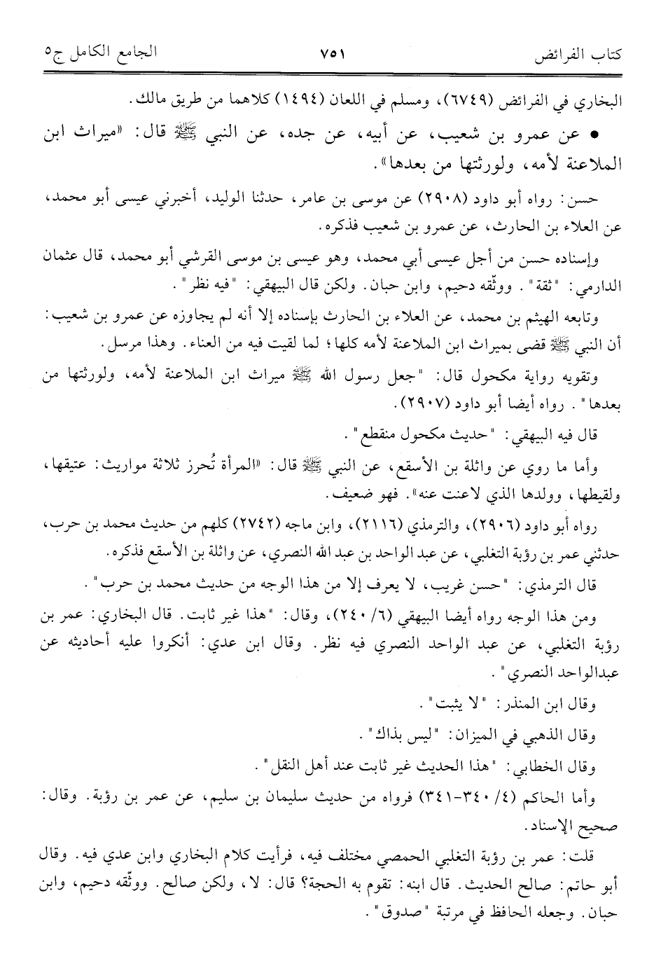 • عن عمرو بن شعيب، عن أبيه، عن جده، عن النبي -صلى اللَّه عليه وسلم- قال: "ميراث ابن الملاعنة لأمه، ولورثتها من بعدها".