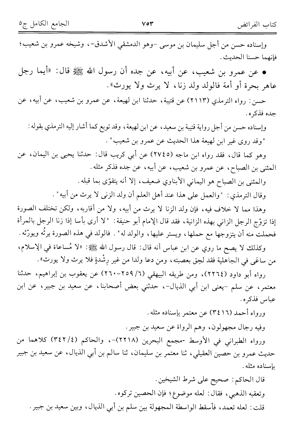 • عن عمرو بن شعيب، عن أبيه، عن جده أن رسول اللَّه -صلى اللَّه عليه وسلم- قال: "أيما رجل عاهر بحرة أو أمة فالولد ولد زنا، لا يرث ولا يورث".