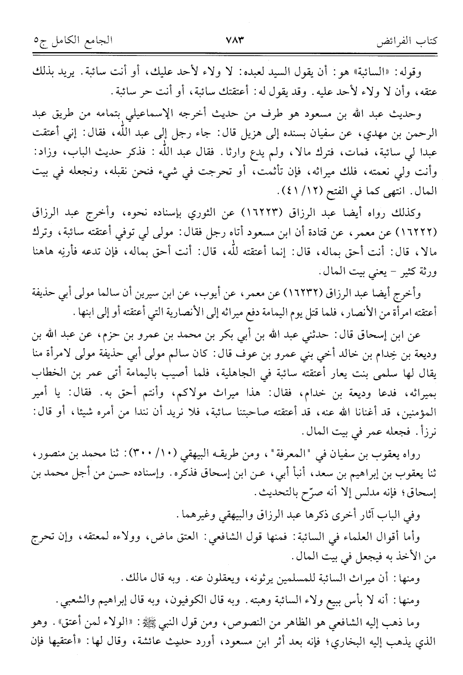 وأخرج أيضًا عبد الرزاق (١٦٢٣٢) عن معمر، عن أيوب، عن ابن سيرين أن سالما مولى أبي حذيفة أعتقته امرأة من الأنصار، فلما قتل يوم اليمامة دفع ميراثه إلى الأنصارية التي أعتقته أو إلى ابنها.